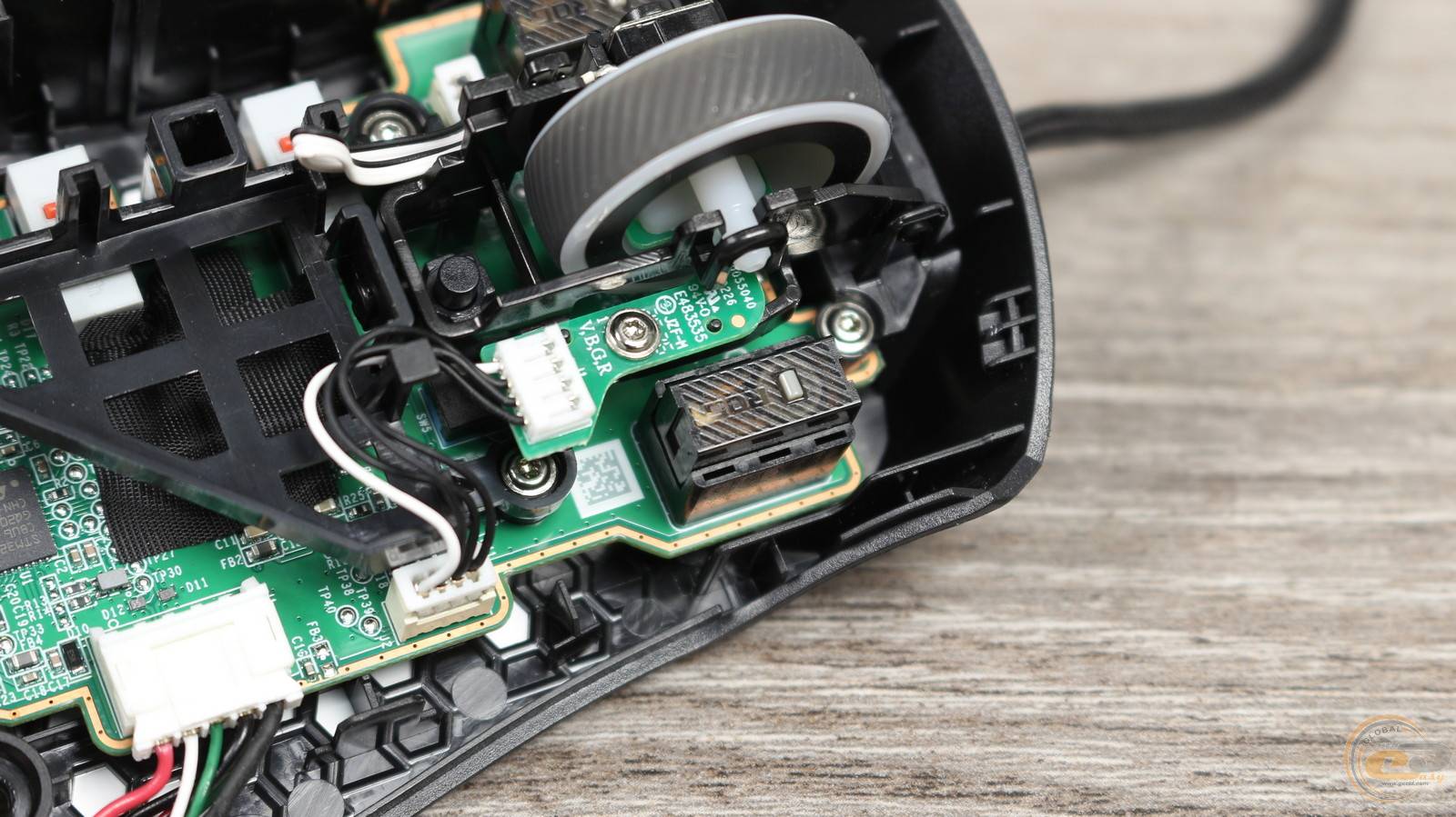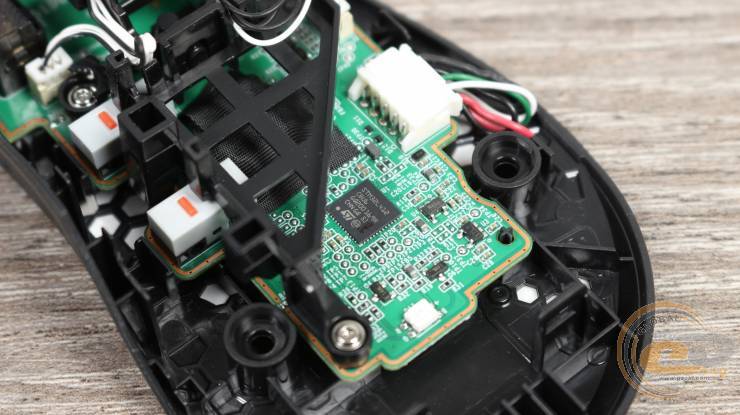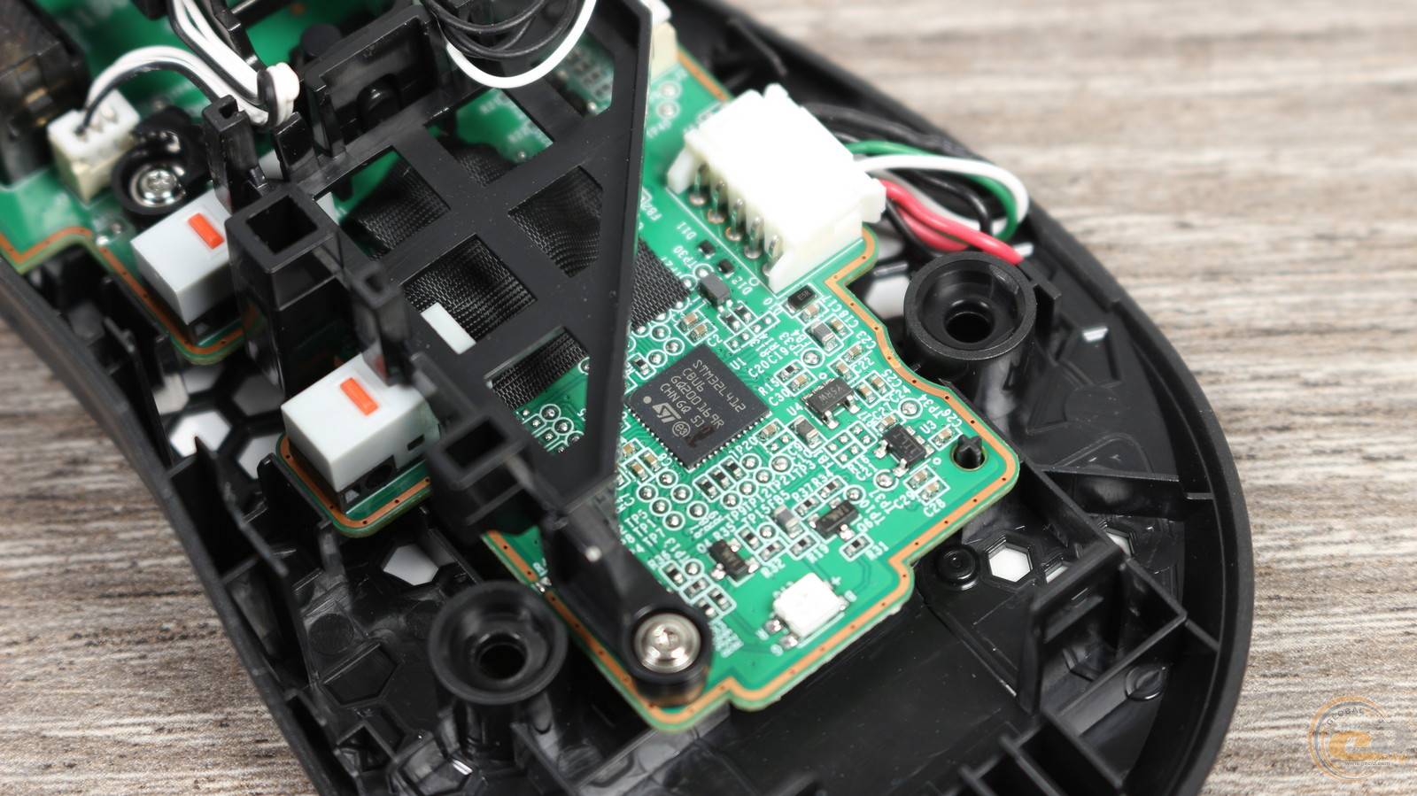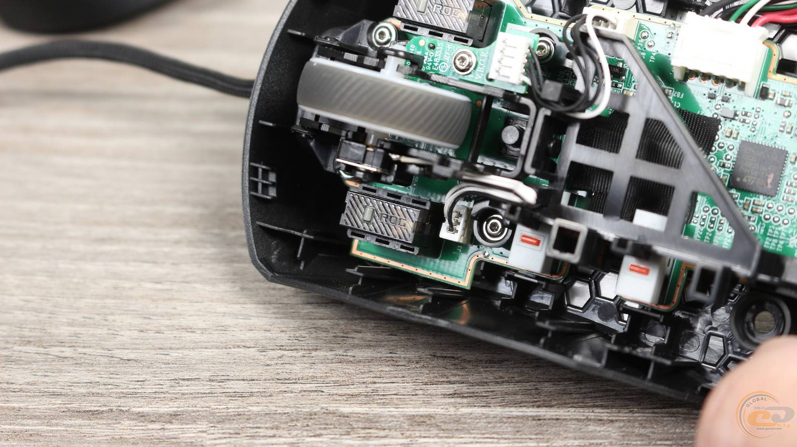 По центру плати — оптичний сенсор PAW 3311 з роздільною здатністю 12000 DPI. Він прикритий текстильною накладкою. Нижче — контролер STM32L. Поруч — RGB-світлодіод, що підсвічує логотип ROG на спинці миші.