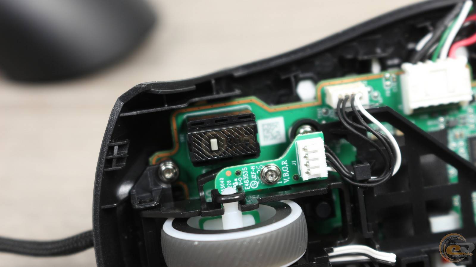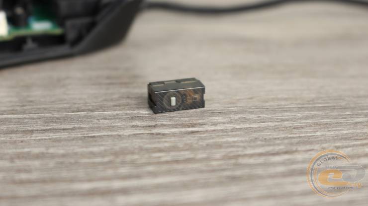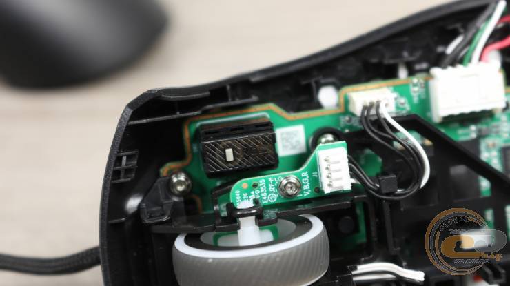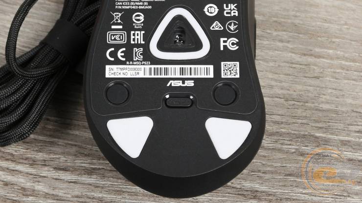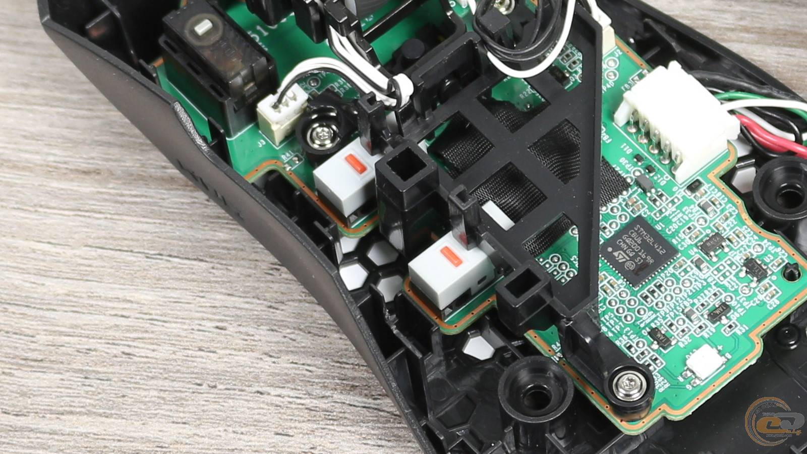 По центру плати — оптичний сенсор PAW 3311 з роздільною здатністю 12000 DPI. Він прикритий текстильною накладкою. Нижче — контролер STM32L. Поруч — RGB-світлодіод, що підсвічує логотип ROG на спинці миші.