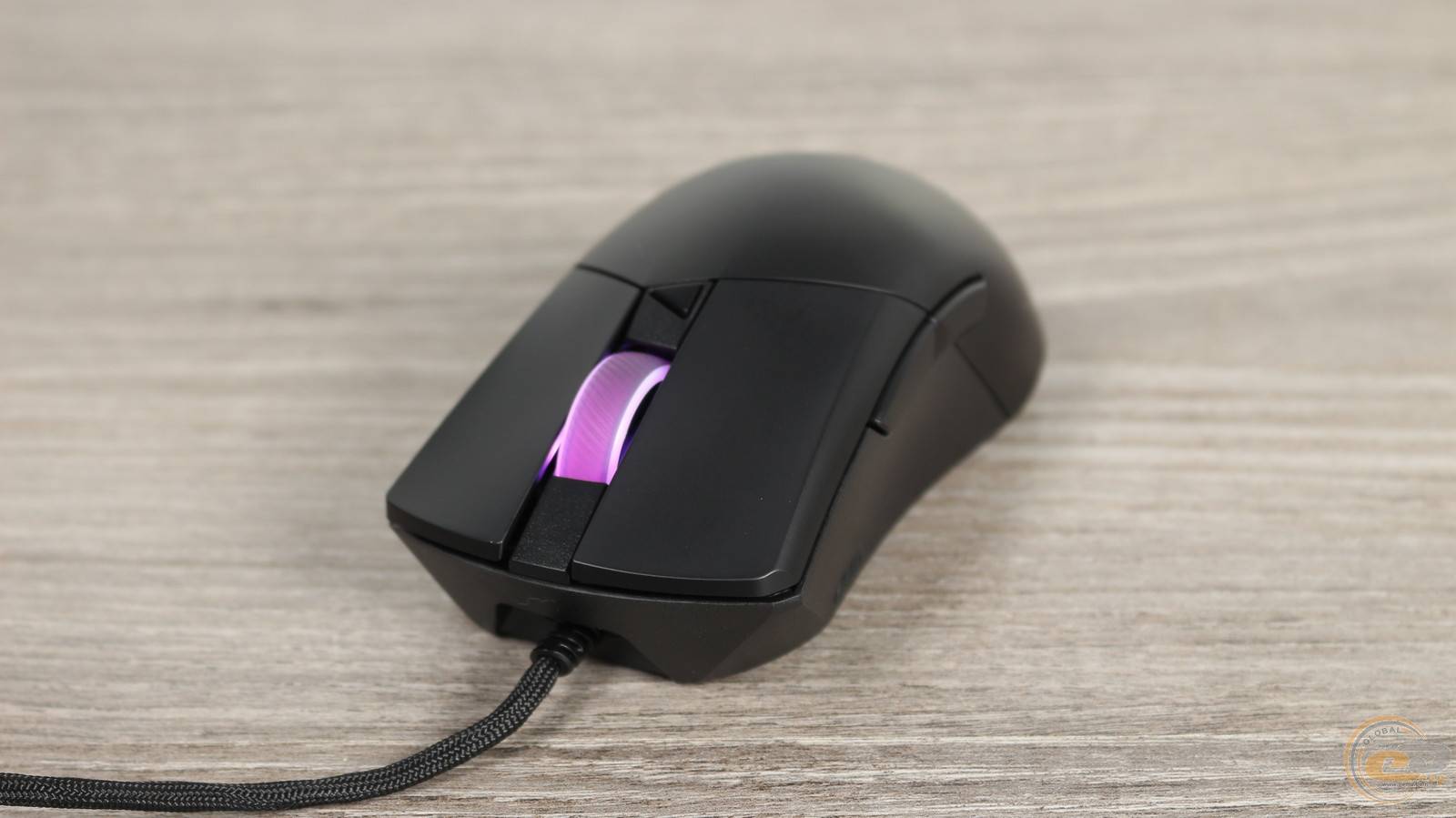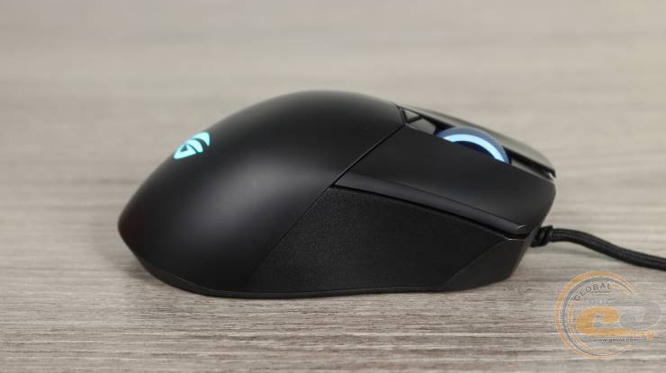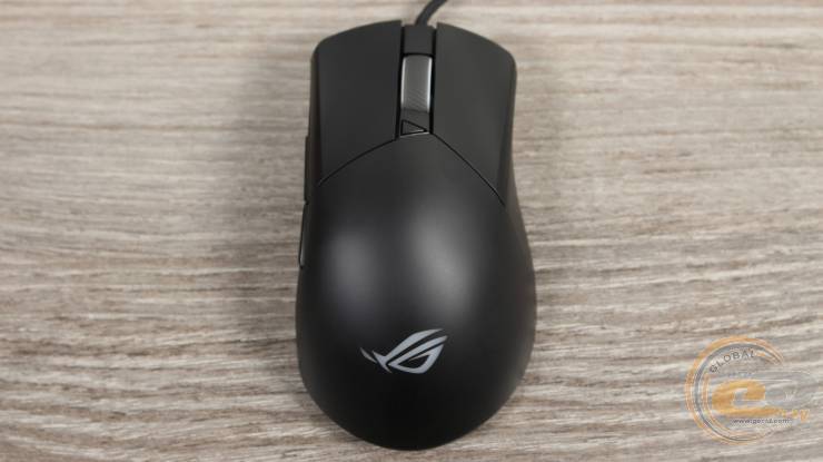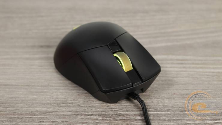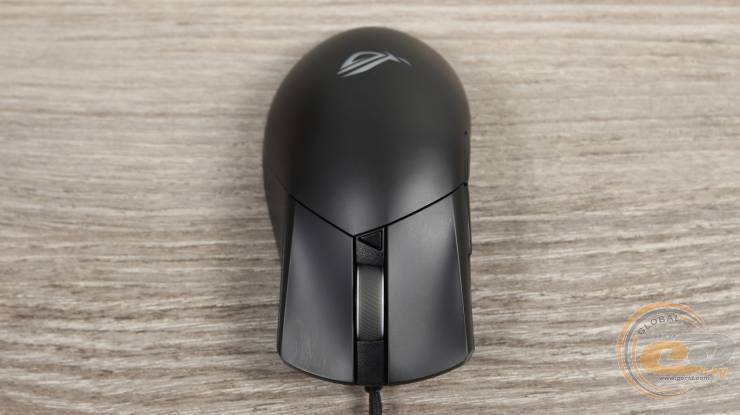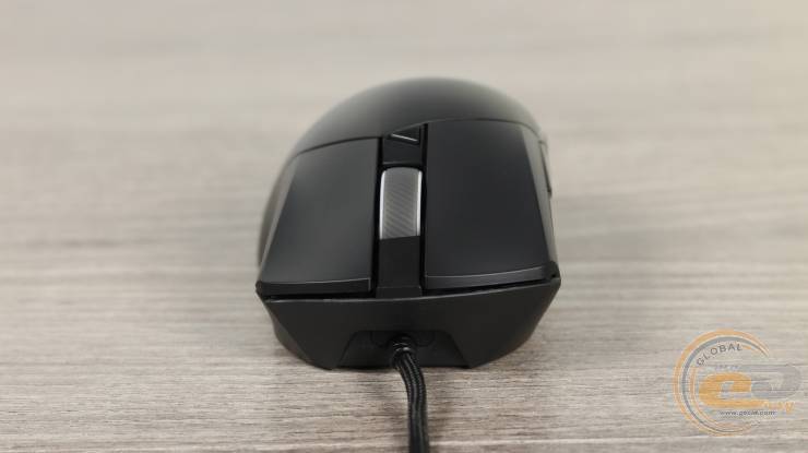 У верхній частині розташоване напівпрозоре коліщатко прокручування з гумовим протектором і діагональними насічками. Воно підтримує RGB-підсвітку та ASUS Aura Sync. Поруч знаходиться невелика трикутна кнопка перемикання DPI. Основні кнопки відділені від спинки — це характерна риса конструкції Gladius, яка забезпечує чіткий хід і стабільність натискання. Ліва основна кнопка більша за праву — і за площею, і за формою, що відповідає природному положенню пальців під час хвату.