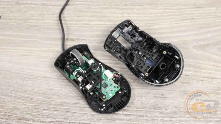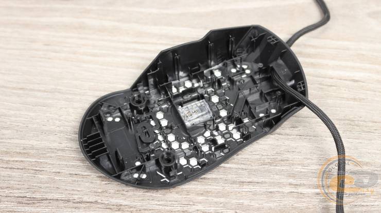 Лінза оптичної системи розміщена на дні корпуса. Для зменшення ваги мишки воно має численні отвори у вигляді сот.