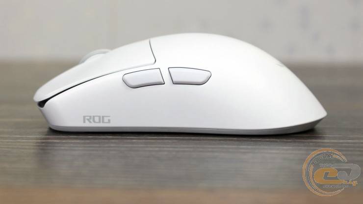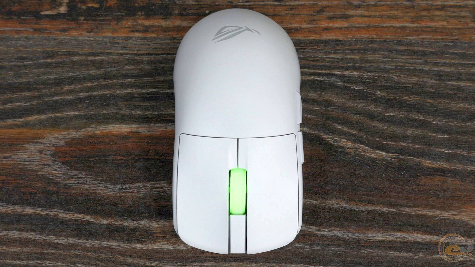 Вигин корпусу зміщено ближче до центру — пальці лягають природно, що зменшує втому під час тривалих ігрових сесій. Натискання — стабільне, без люфтів. Миша оснащена фірмовими оптичними перемикачами ROG із ресурсом у 100 мільйонів натискань. Відбір — попарний, із відхиленням сили натискання до 5 г. Заради максимальної легкості конструкції заміну перемикачів не передбачено. Відгук — швидкий, точний, без дебаунсу.