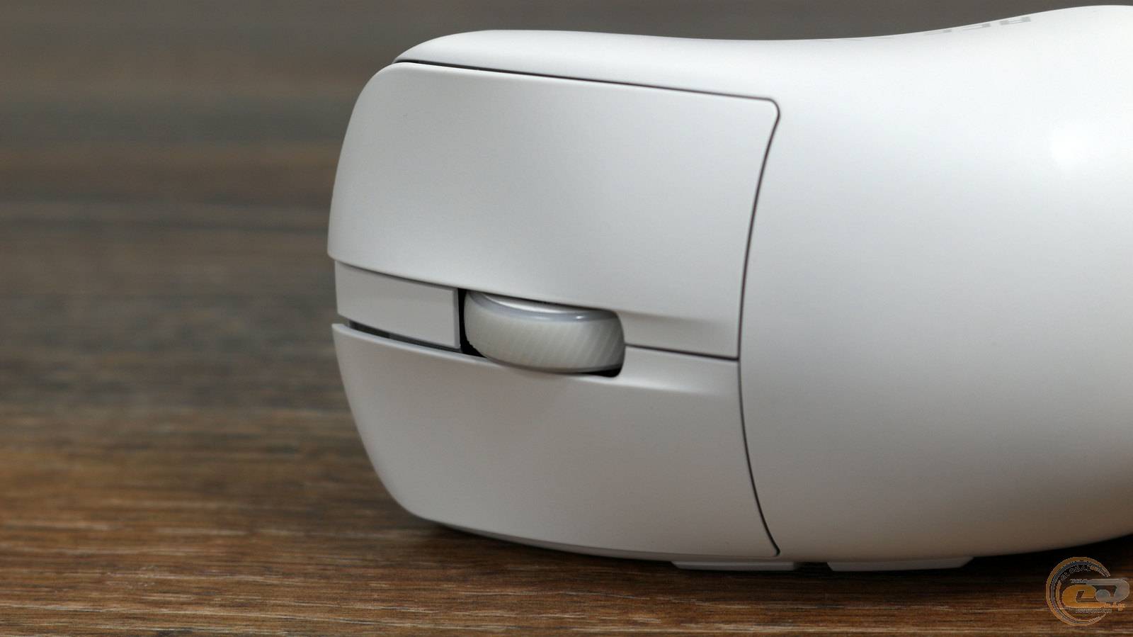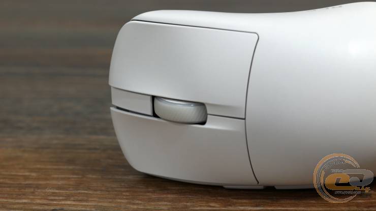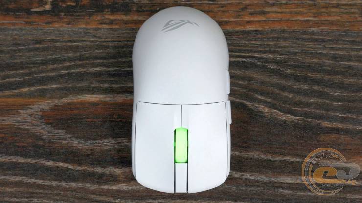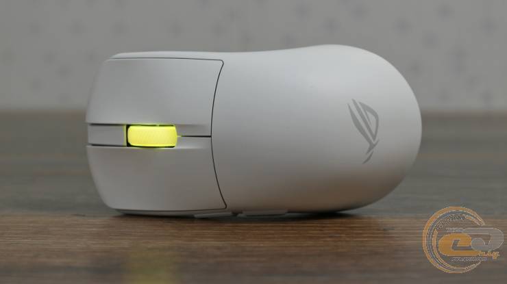 Коліщатко прокручування розташоване між основними кнопками, із легким заглибленням у передній частині. Воно обладнане напівпрозорим гумовим протектором із текстурою, яка забезпечує чітке зчеплення пальця. Підтримується RGB-підсвічування, що змінюється залежно від режиму роботи. Це єдина зона підсвічування у миші, що цілком логічно з огляду на її мінімальну вагу.