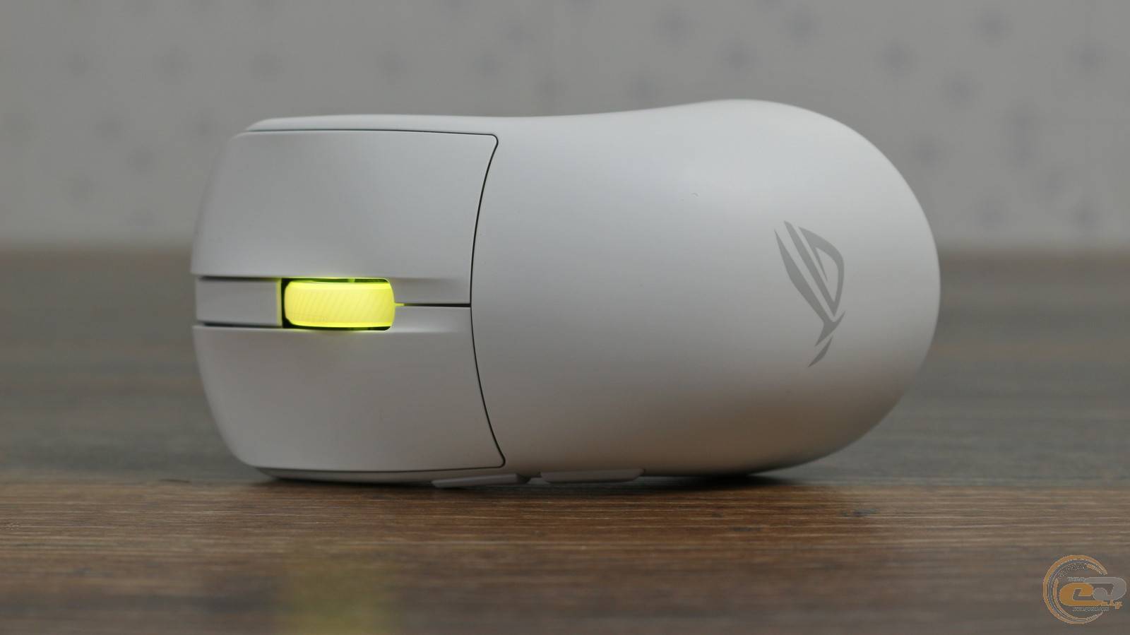 Під кнопками встановлені оптичні перемикачі ROG Optical Micro Switches. Вони не мають дебаунсу, не схильні до даблкліків, і розраховані на ресурс до 100 млн натискань. Зусилля натискання — дуже м’яке, значно легше за класичні механічні перемикачі. Це дозволяє спамити кліки без втоми, але може не сподобатись тим, хто звик до глибокого тактильного відгуку. Клік — швидкий, чіткий, але без пружного відскоку, притаманного звичайним механічним перемикачам. Звук натискання — гучний, дзвінкий, без металевого призвуку.