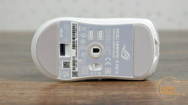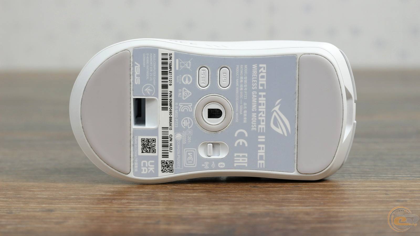 Дно Harpe II Ace також виконане з біонейлону, проте має гладку текстуру. Воно оснащене двома великими PTFE-ніжками — одна спереду, одна ззаду. Їхні краї мають 2.5D-обробку: вони легко заокруглені, що знижує опір на м’яких килимках і покращує плавність мікроприскорень. Додаткових отворів для зручної заміни ніжок не передбачено. Над задньою ніжкою розташовано отвір для зберігання наноресивера. Уся поверхня дна, окрім ніжок, вкрита сірим стікером з технічною інформацією.