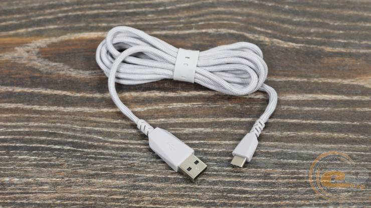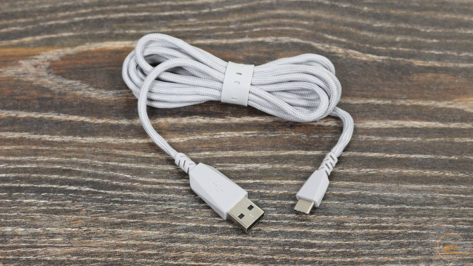 Зарядний кабель має довжину близько 1,8 м при товщині у 3,3 мм. Він виготовлений з м'якого та гнучкого матеріалу й обгорнутий у надійне нейлонове обплетення Paracord, що забезпечує додаткову довговічність. На одному кінці - роз'єм USB Type-A, а на іншому — USB Type-C, обидва з яких мають захист від перегину, що запобігає пошкодженню. Незважаючи на середню гнучкість, грати під час заряджання цілком комфортно — без помітних обмежень.