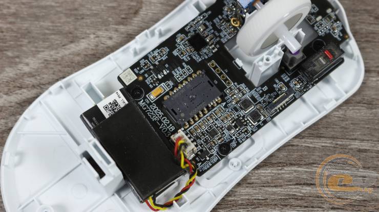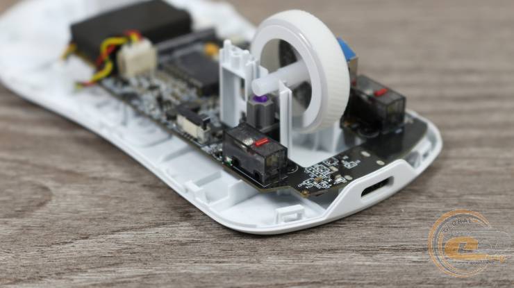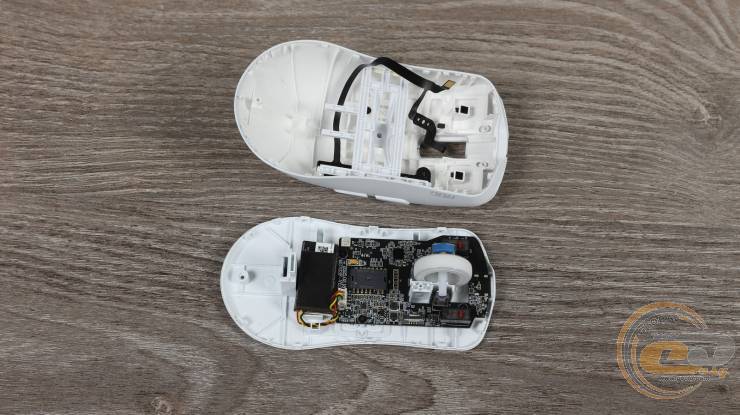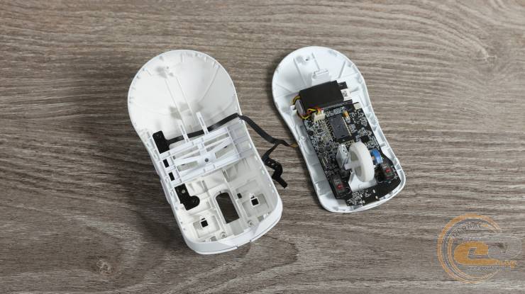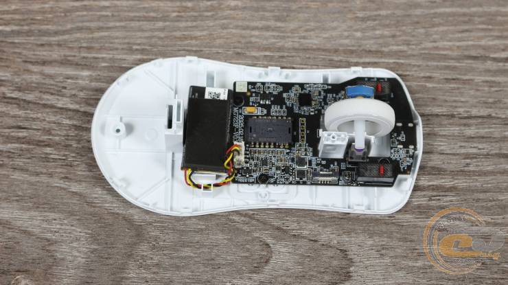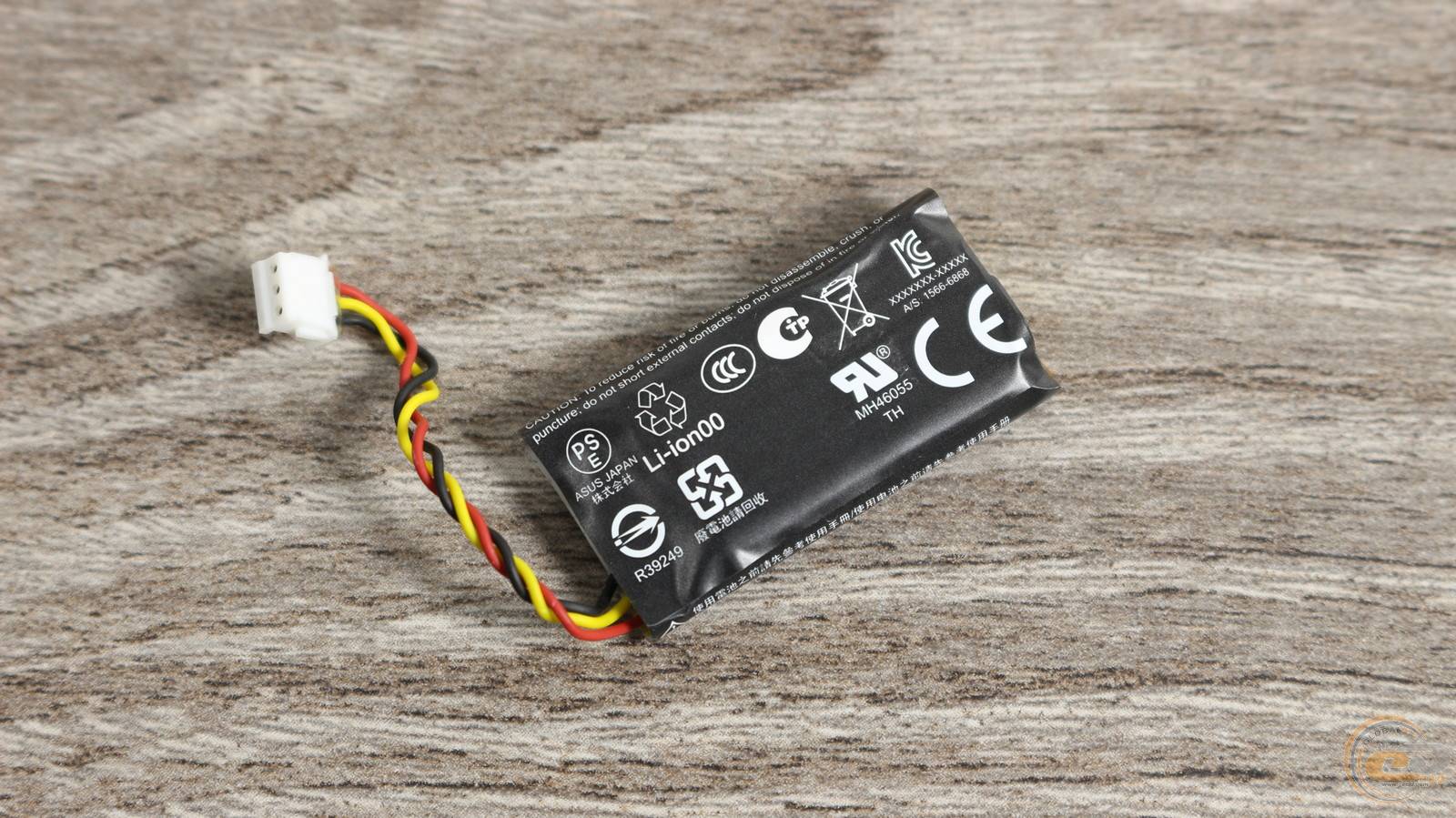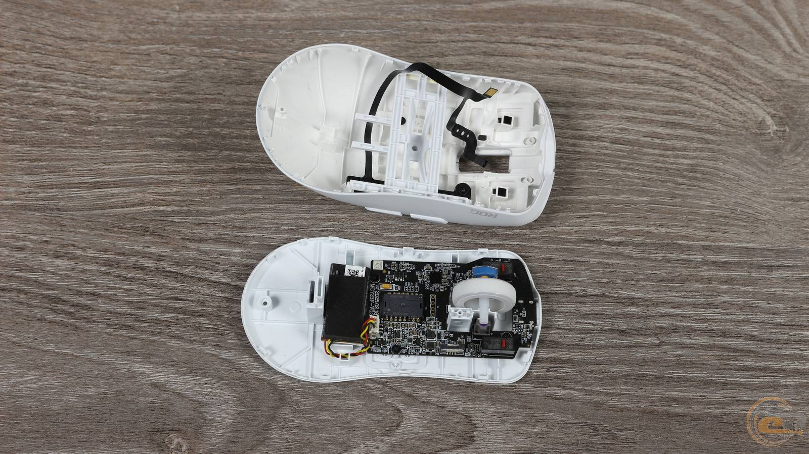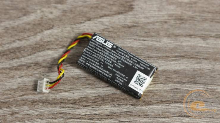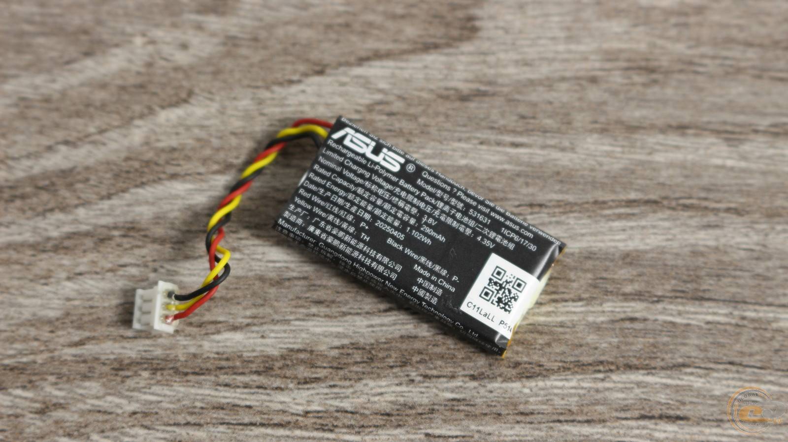 Поряд з платою встановлено компактний акумулятор ємністю 1,102 Вт·год (290 мА·г, 3,8 В), виробництва Guangdong Highpower. Незважаючи на велике лого ASUS, це мінімум, який зазвичай застосовують у мишах такого класу.
