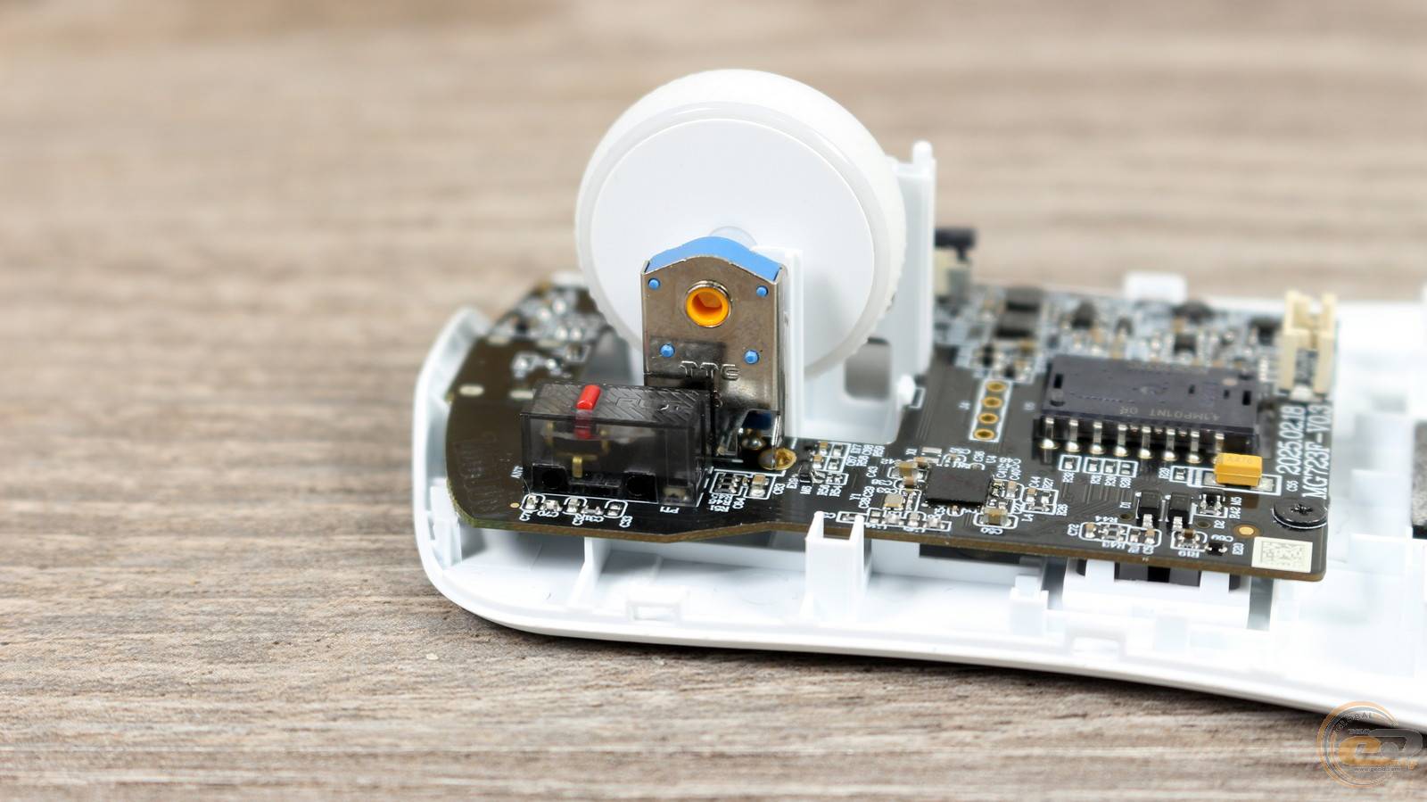 Над сенсором розташований прямокутний отвір для коліщатка прокручування. Зліва від нього — механічний енкодер TTC Gold Dust Proof з 24 чіткими відсічками, пилозахищеним корпусом і ресурсом понад 100 млн обертів. Скрол працює стабільно, без паразитних імпульсів, з рівномірною тактильною віддачею. У порівнянні з оптичними рішеннями — тут усе контрольовано, без люфтів і випадкових прокрутів. Виробника перемикача скролу ідентифікувати не вдалося.