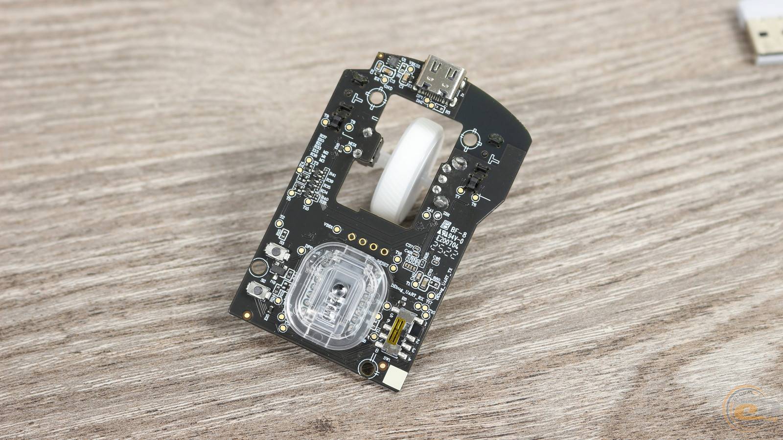 На протилежному боці плати знаходиться лінза сенсора, два мікроперемикачі кнопок PAIR і DPI, регулятор режиму підключення та роз’єм USB-C.