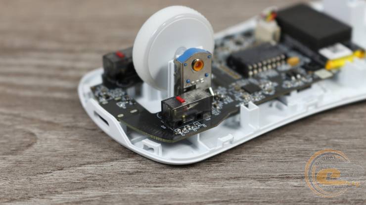 Колесо прокручування використовує механічний енкодерTTC Gold Dust Proof: корпус діаметром 18 мм, 24 чіткі відсічки, ресурс — понад 100 млн обертів. Прокрутка майже безшумна, кожен крок інформативний і приємний. Гумова напівпрозора накладка забезпечує відмінне зчеплення. Перемикач під колесом без маркування, виробника не встановлено.