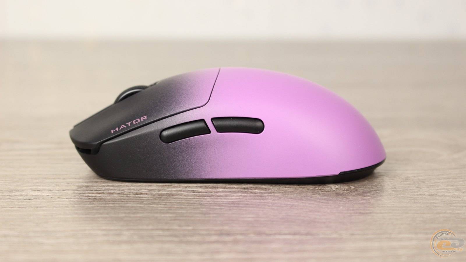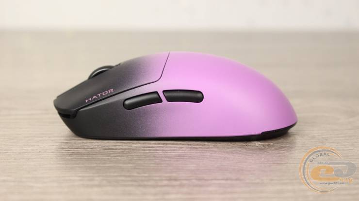 На лівій боковині відсутні декоративні елементи чи додаткове підсвічування, що було характерним для інших моделей. Тут усе максимально функціонально: лише дві бокові кнопки, без кольорових експериментів. Єдиний напис — акуратний фіолетовий HATOR на чорному уздовж лівої основної кнопки, який не відволікає й не порушує загальну строгість вигляду.