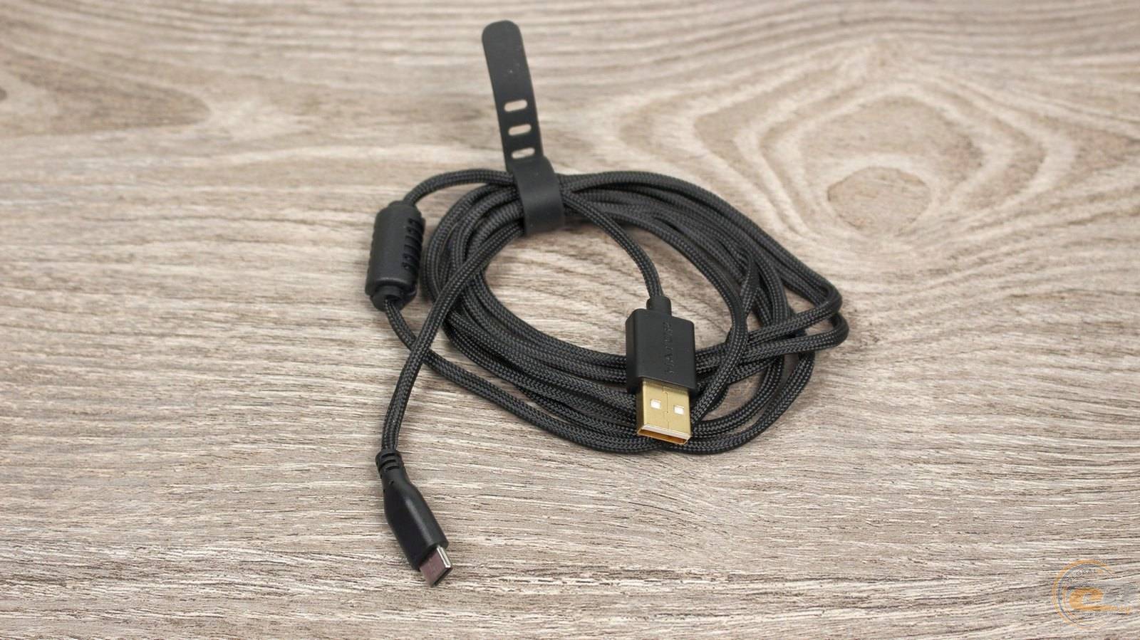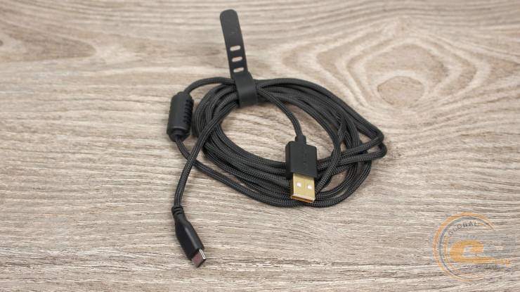 Особливість комплектного кабелю полягає в його асиметричній конструкції: вихід дроту має вигин угору, завдяки чому він не треться об килим безпосередньо біля миші. Це рішення нагадує компактний тримач для кабелю й робить користування під час заряджання значно комфортнішим.
