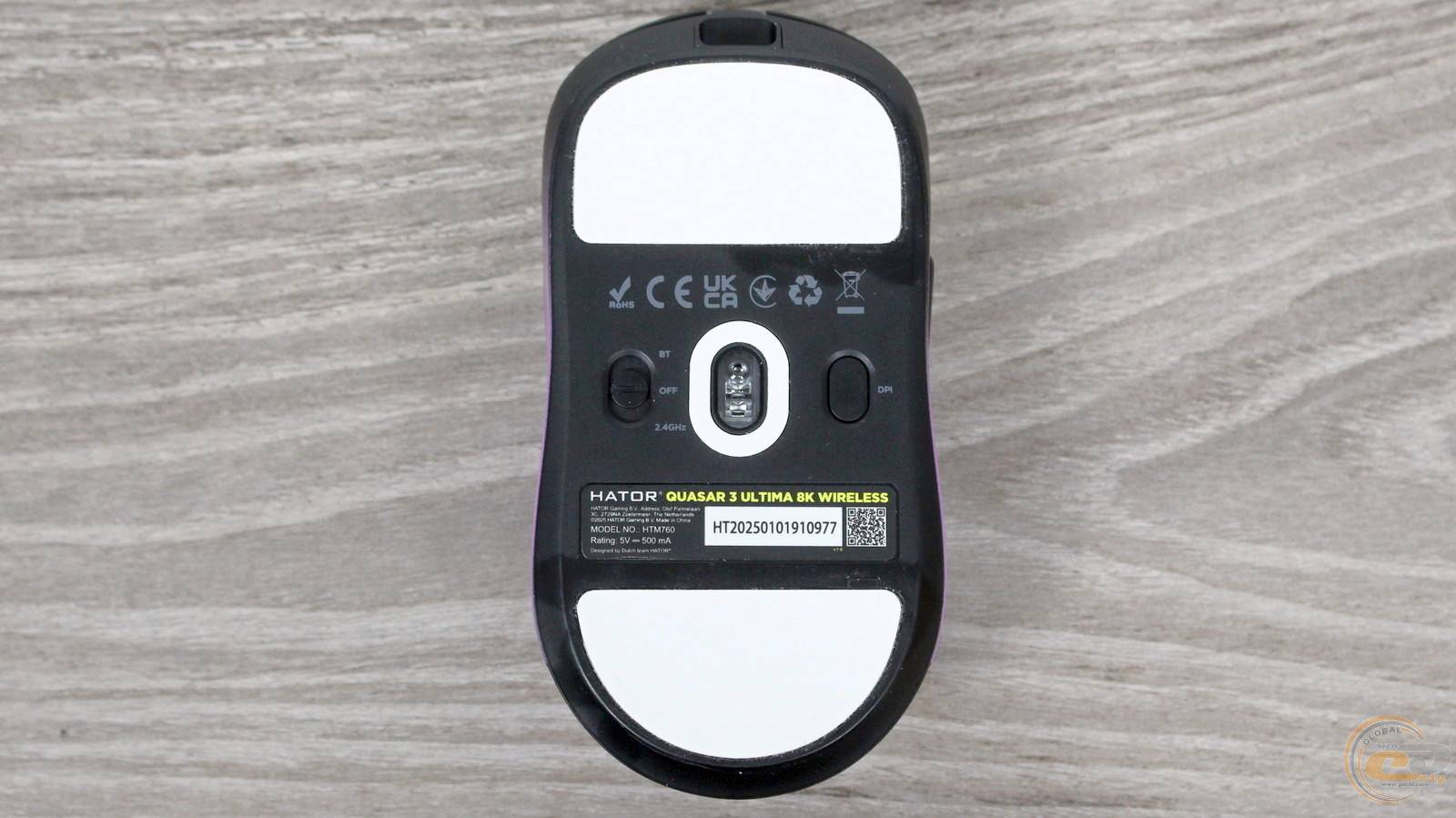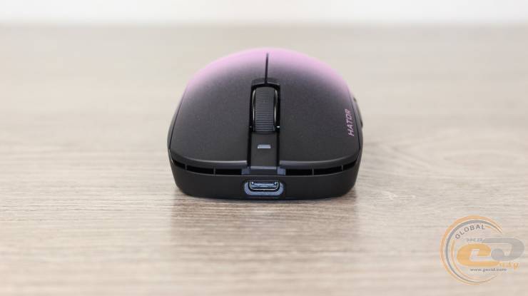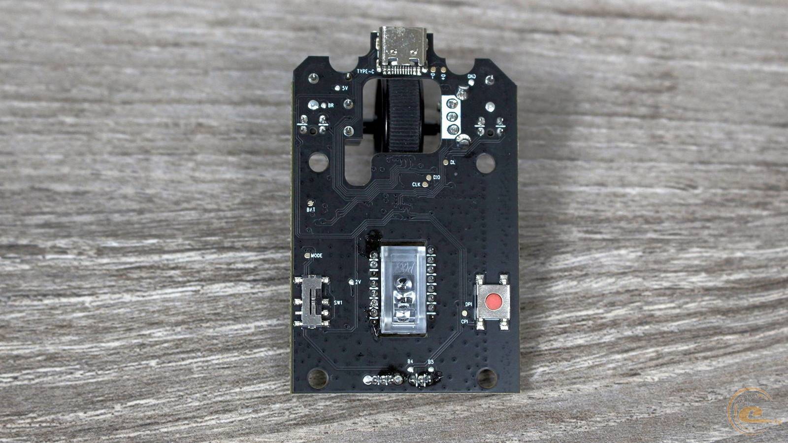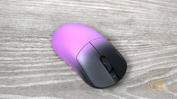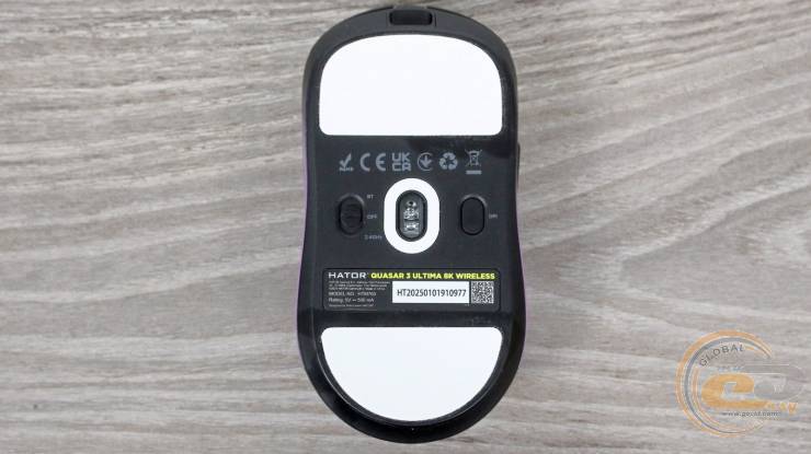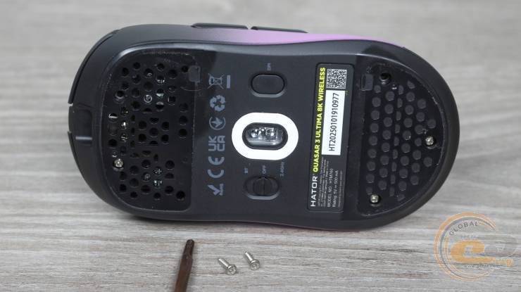 У геометричному центрі корпуса розташоване віконце сенсора, обрамлене додатковим кільцем зі скругленою формою, яке захищає сенсор і сприяє плавному ковзанню. Поруч знаходиться перемикач режимів роботи (дротовий USB, бездротовий 2,4 ГГц або Bluetooth 5.4) та кнопка зміни DPI, що забезпечує швидке перемикання між режимами й чутливістю.