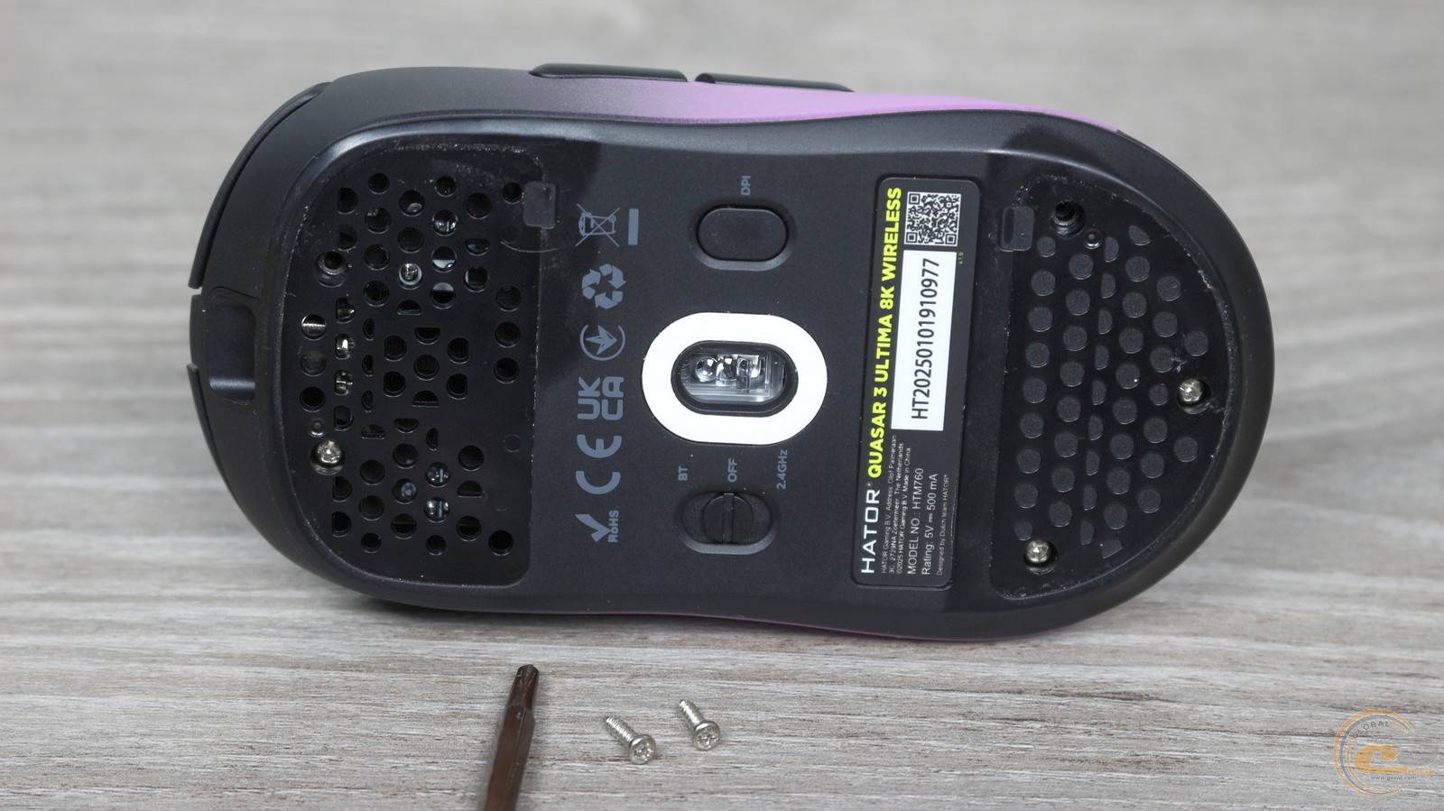 Для розбирання миші потрібно відклеїти глайди, під якими знаходяться п’ять невеликих гвинтів. Щоб це було зручно, у корпусі передбачені спеціальні вирізи біля одного з кутів кожної ніжки — у них легко вставити тонкий інструмент і підчепити накладку.