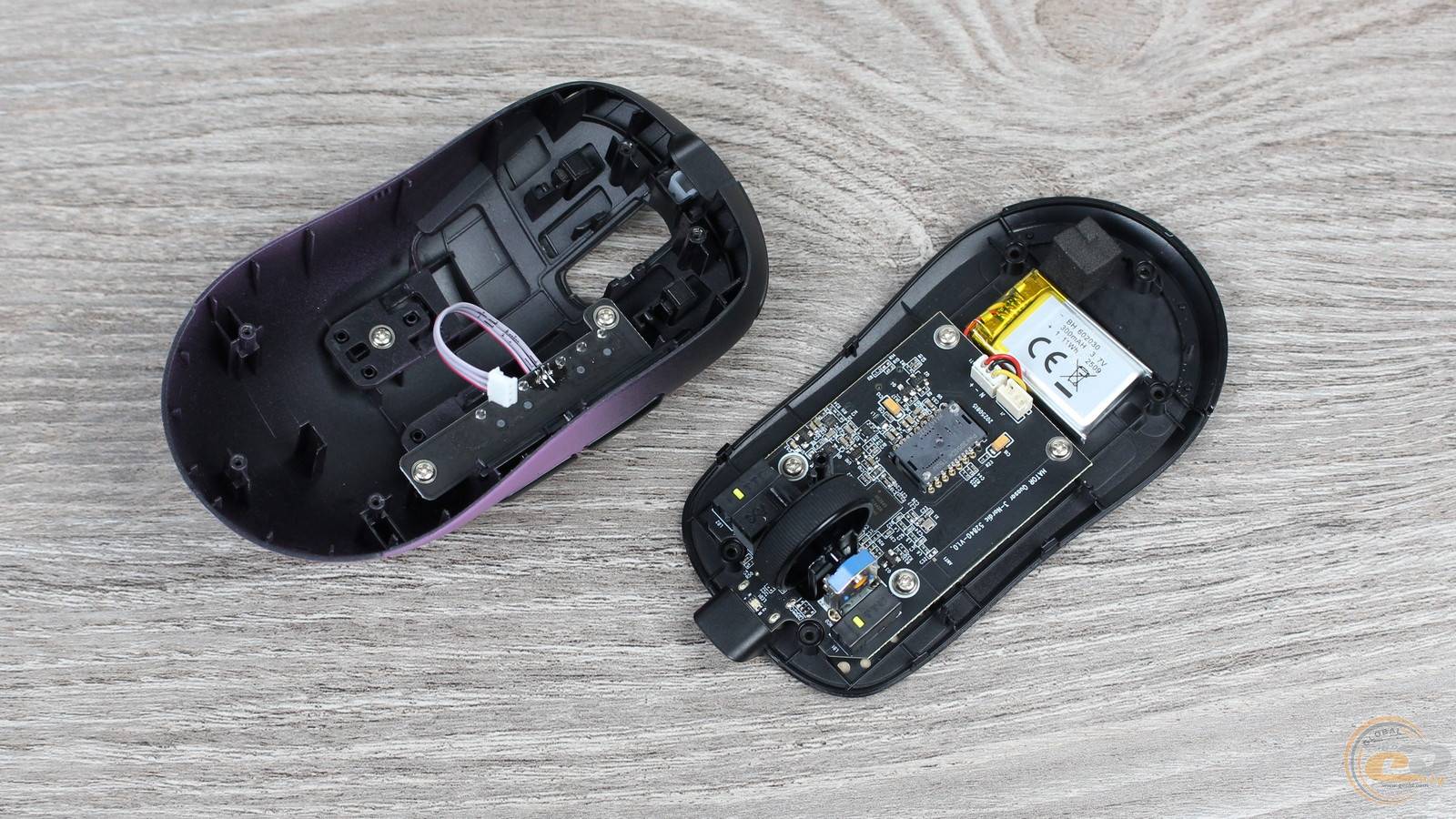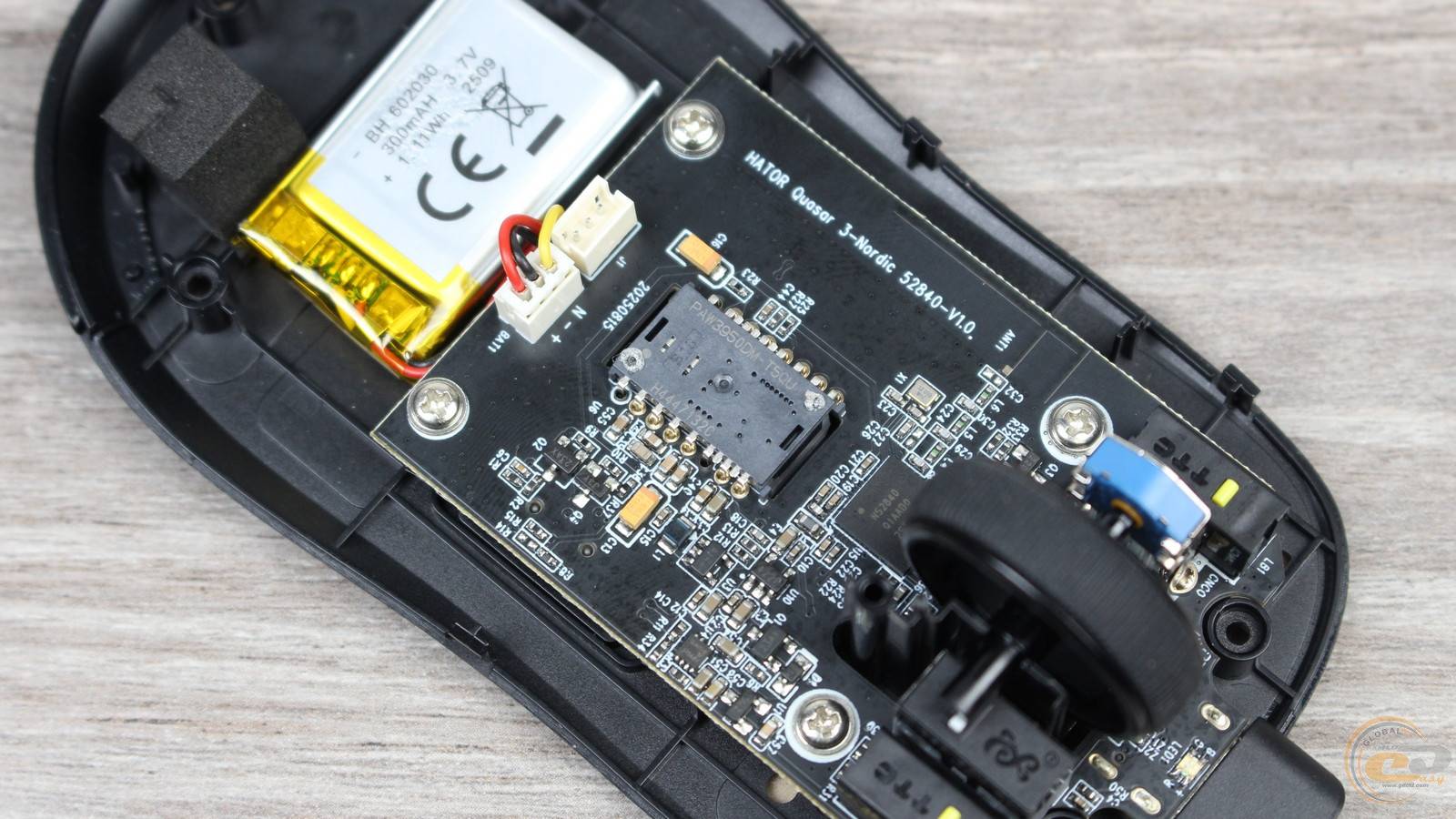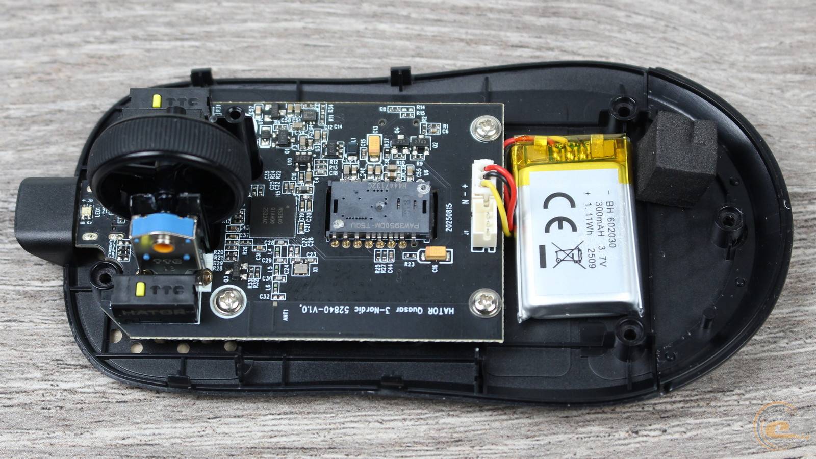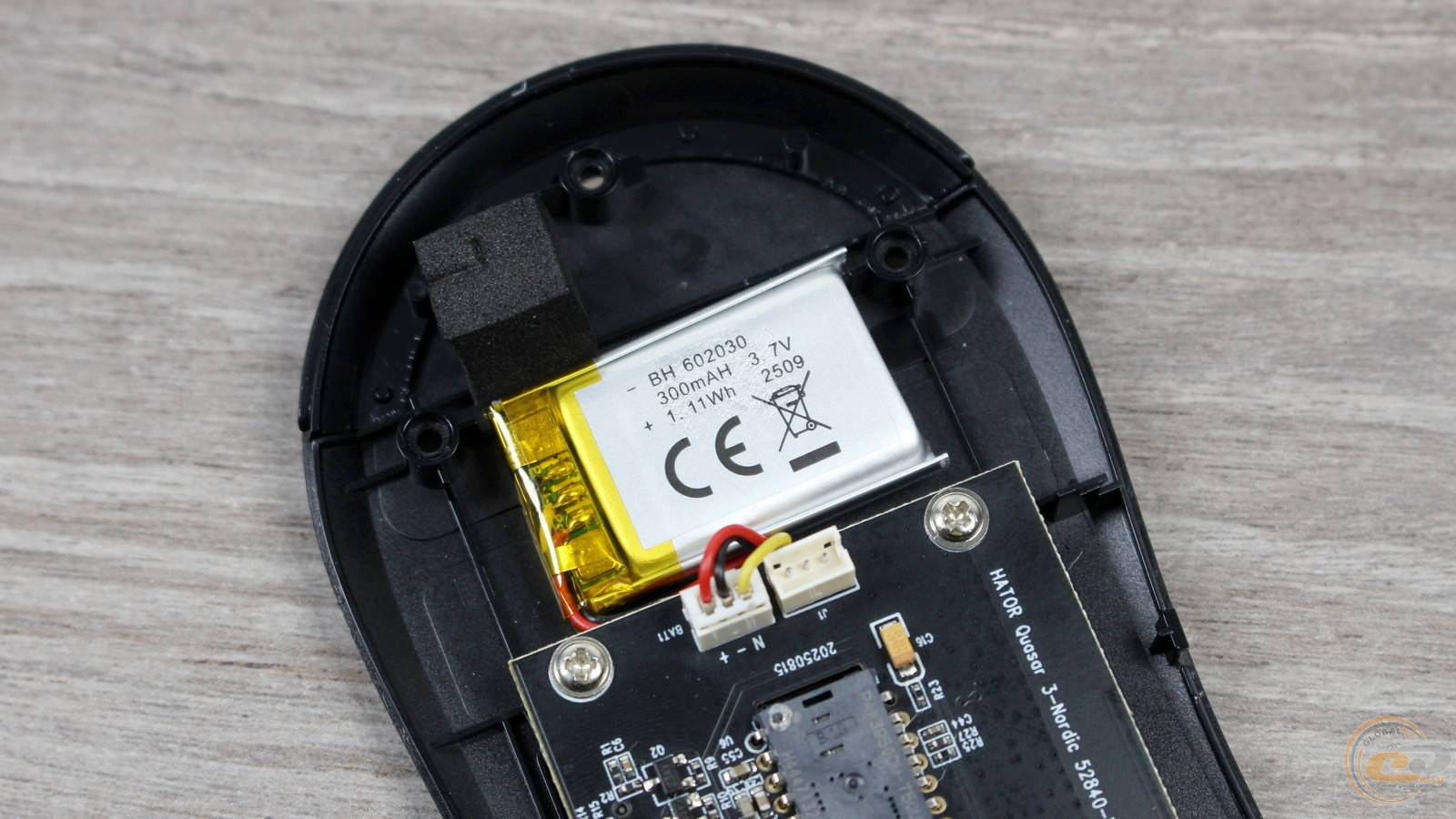 До нижнього краю основної плати підключено два шлейфи: один веде до акумулятора ємністю 300 мА·год, інший — до невеликої додаткової плати з бічними кнопками.