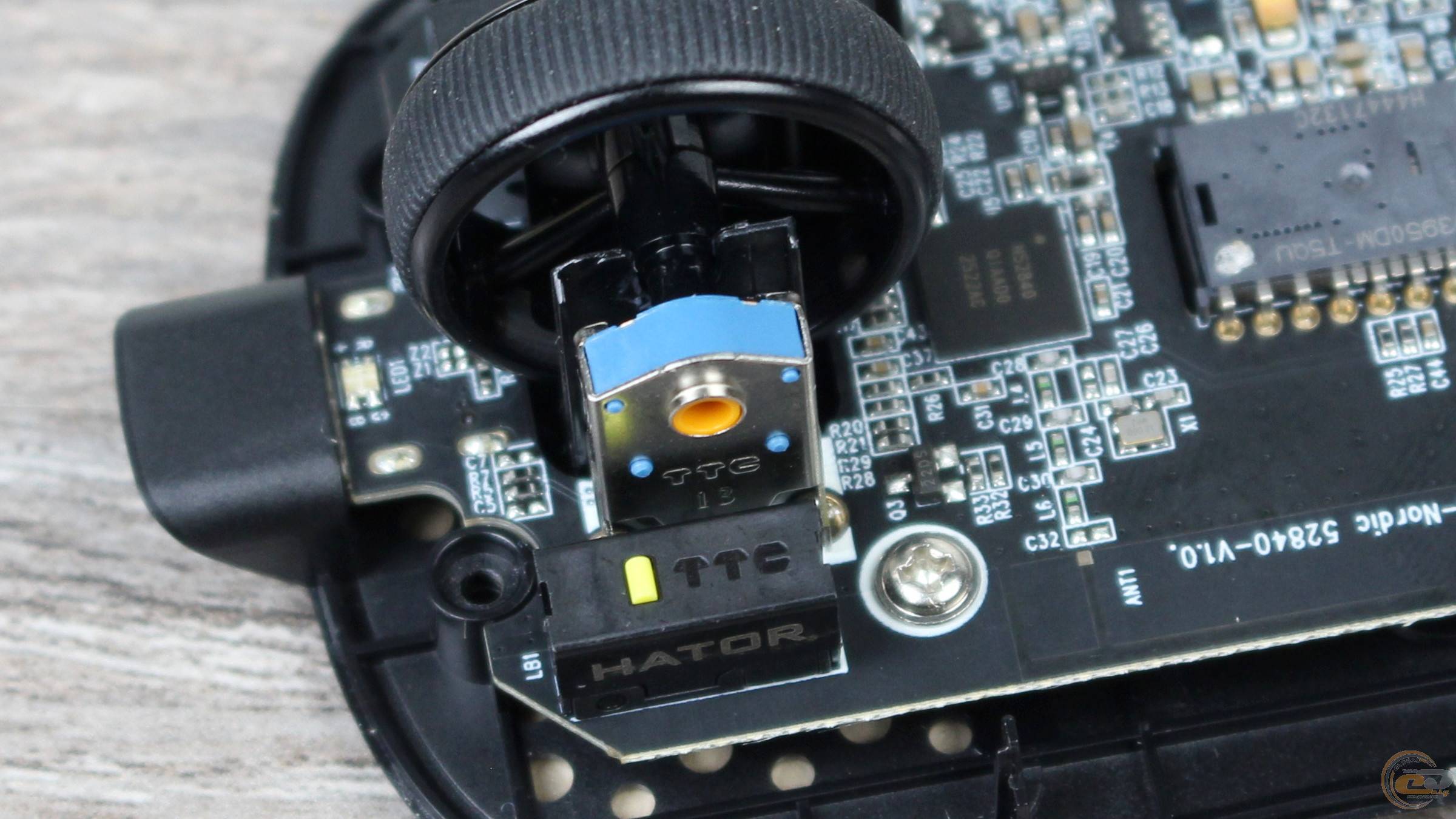 Енкодер колеса прокрутки — TTC Gold 13 мм із 24 кроками та захистом від пилу. Колесо працює з помірним шумом, кроки чіткі та добре відчутні, тактильність збалансована. Натискання вимагає помірного зусилля. Додаткову кнопку під колесом ідентифікувати не вдалося.
