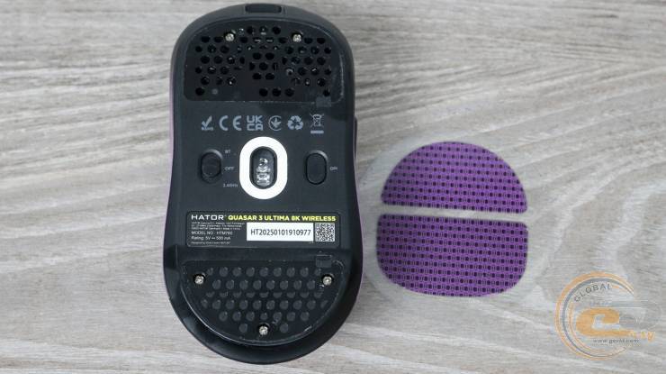 На відміну від Quasar 3 Ultra з рожевими боковими кнопками та яскравим низом, у новинки з фіолетовими акцентами дно виконане в чорному кольорі, а підсвічування колеса й нижньої частини корпусу повністю прибрали. Також зник великий напис «8K», який викликав найбільше нарікань. У результаті миша виглядає стримано та по‑дорослому, без зайвих декоративних елементів. Це позитивна зміна для тих, хто вважав попередні кольорові експерименти надмірними. Мінімалізм доведений до кінця, і саме він робить Ultima більш універсальною та доречною як у геймерському сетапі, так і в робочому середовищі.