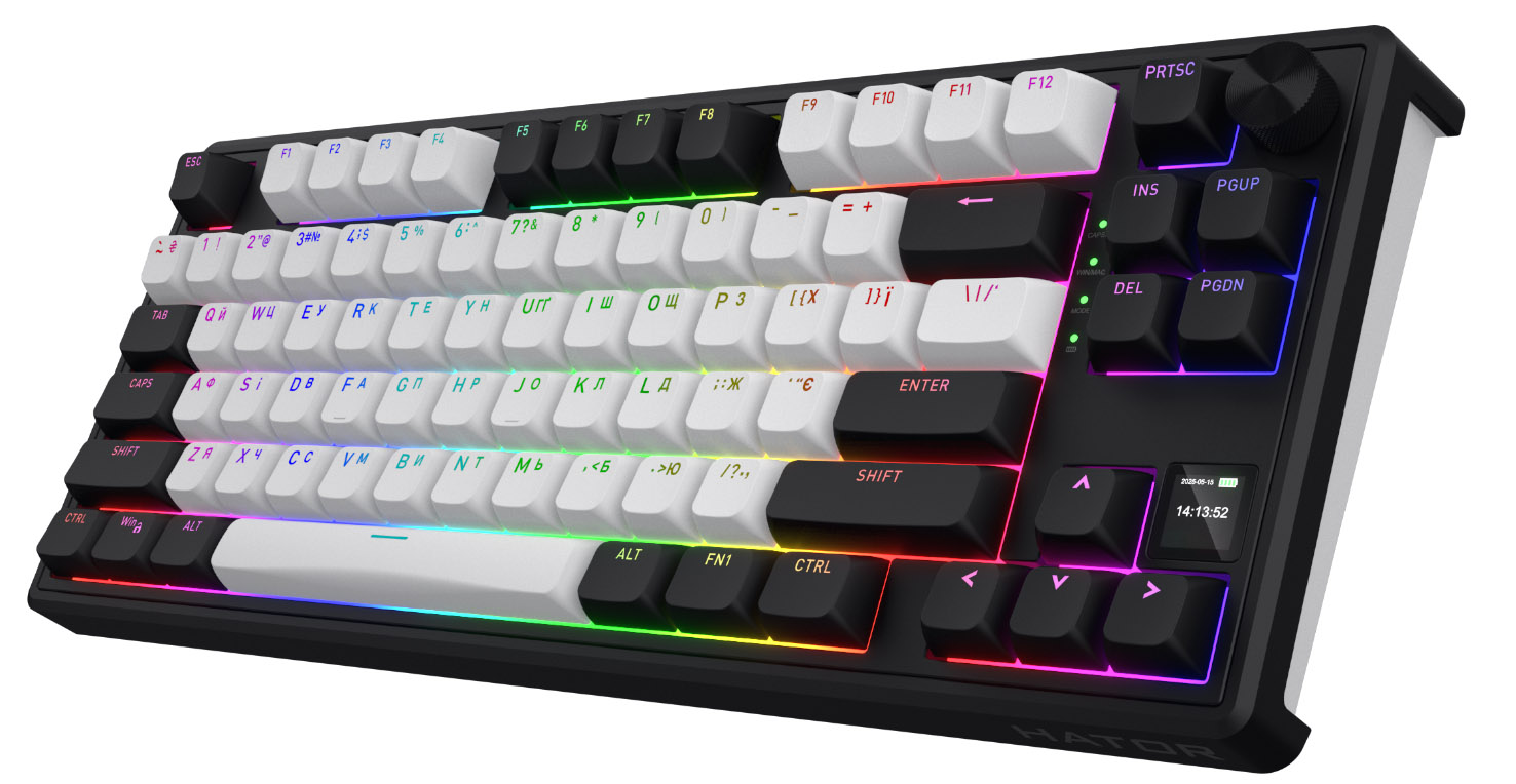 Розкладка має свої особливості у порівнянні з типовими 80% клавіатурами. Через інтеграцію кольорового TFT-екрана та металевого кноба виробник відмовився від клавіш Prt Scr, Scroll Lock і Pause/Break. Блок PgUp/PgDn та стрілки зміщені трохи лівіше, а Home та End відсутні. Нижній ряд зберігає стандартний пробіл 6.25U, але після правого Alt та Fn1 одразу йде Ctrl — без проміжної клавіші Menu.