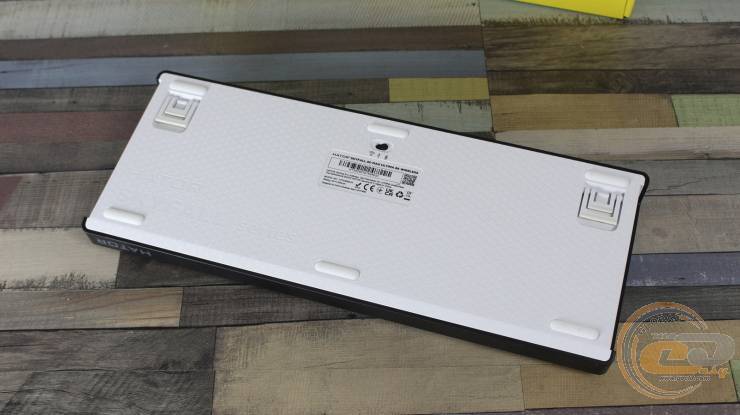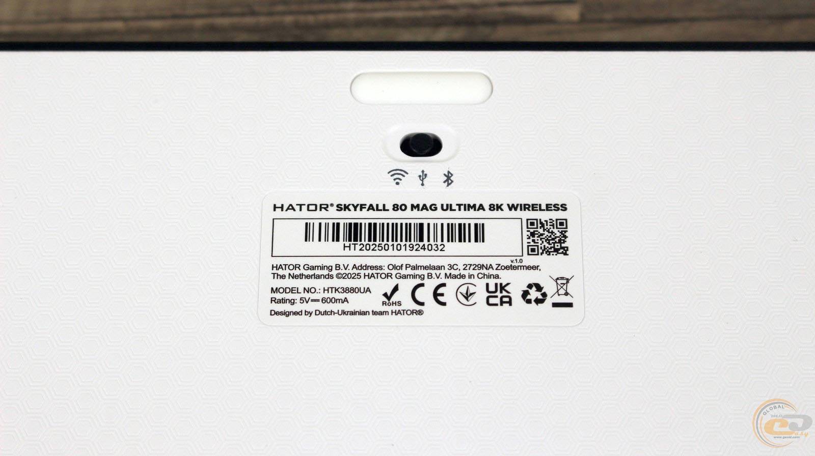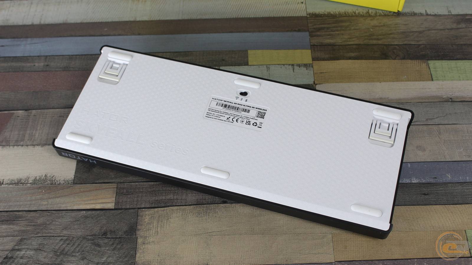 Нижня панель клавіатури виконана з матового білого пластику з рельєфною текстурою у вигляді шестикутних сот. У центрі розташована інформаційна наклейка з назвою моделі, серійним номером та сертифікаційними позначками. У лівому нижньому куті нанесено об’ємний напис HATOR SKYFALL series, який додає впізнаваності. По краях корпусу рівномірно розміщено шість гумових опор, що забезпечують надійне зчеплення зі столом і стабільність під час роботи.