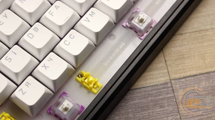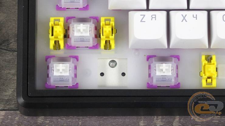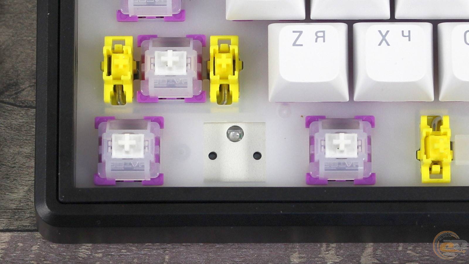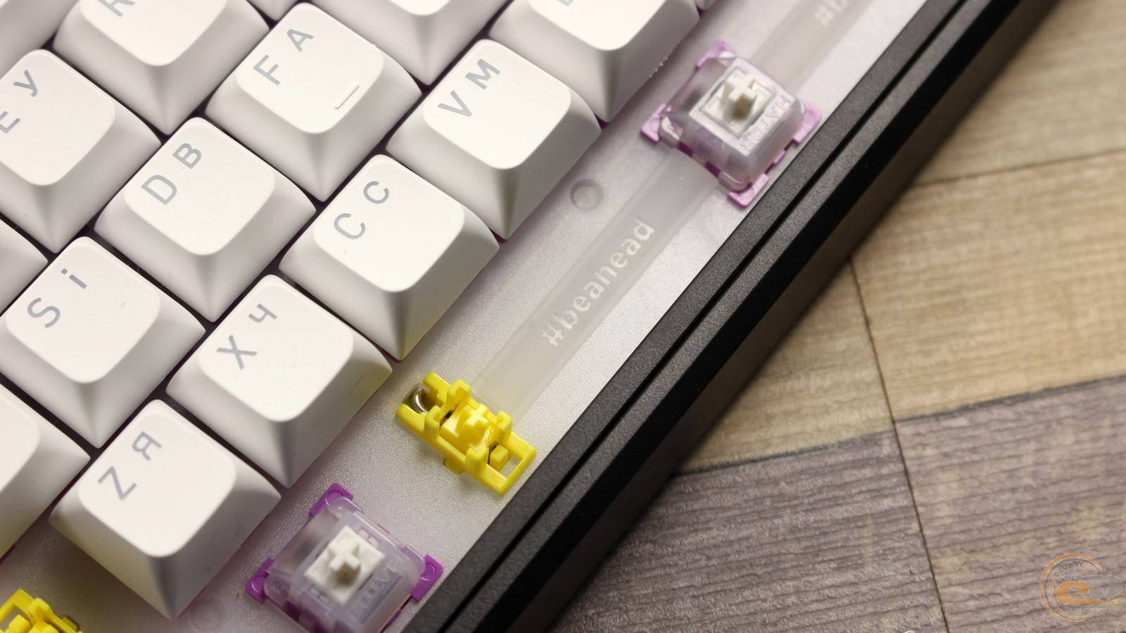 Під клавішею пробілу встановлено стабілізатор із прямою металевою скобою, яка забезпечує рівномірне відчуття натискання по всій площі — без перекосів чи провалів. По обидва боки від основного перемикача розташовано два напівпрозорі елементи з еластичного пластику, які додатково приглушують шум і роблять тактильні відчуття під час друку більш комфортними.