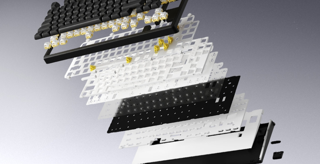 Клавіатура має багатошарову систему шумоізоляції: демпфер із PORON між плейтом і PCB, прокладки IXPE та PET під перемикачами, ізоляцію зворотного боку плати й силіконову основу під PCB. Така конструкція знижує паразитні звуки, мінімізує резонанс і формує глибший, контрольований звук натискання.