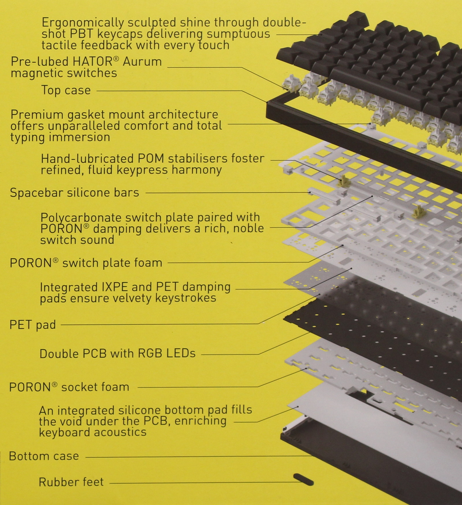 Така конструкція забезпечує сумісність із різними магнітними перемикачами — від HATOR Aurum Ice до серії Gateron Jade (Jade, Jade Pro, Jade Gaming). Це дає користувачам можливість експериментувати з різними типами перемикачів, налаштовуючи клавіатуру під власні потреби та вподобання.