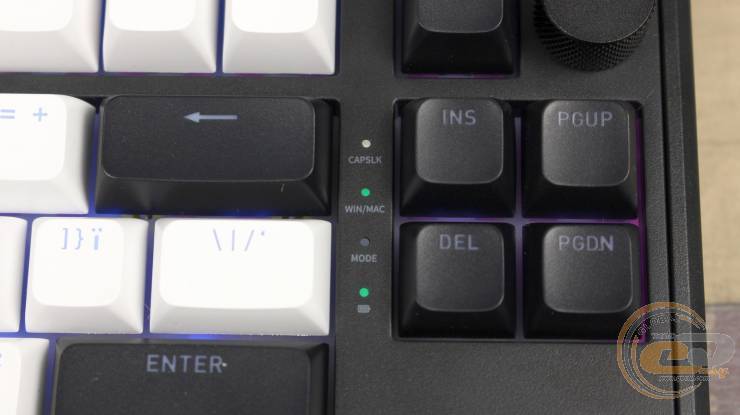 Між основним блоком клавіш і двома кнопками INS та DEL розташовано чотири світлодіодні індикатори: CAPS LOCK, WIN/MAC, MODE та Battery. Вони відображають відповідно статус Caps Lock, активну операційну систему (зелений — Windows, синій — macOS), тип підключення (зелений — 2.4 ГГц, синій — Bluetooth, білий — USB) та рівень заряду акумулятора. Індикатор заряджання світиться червоним під час процесу, гасне після повної зарядки, а при низькому рівні заряду блимає. Індикація реалізована стримано, без надмірної яскравості, і не відволікає під час роботи.
