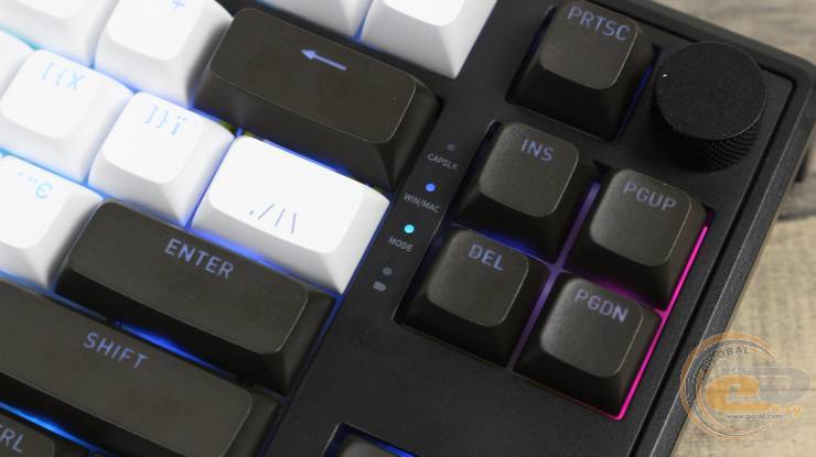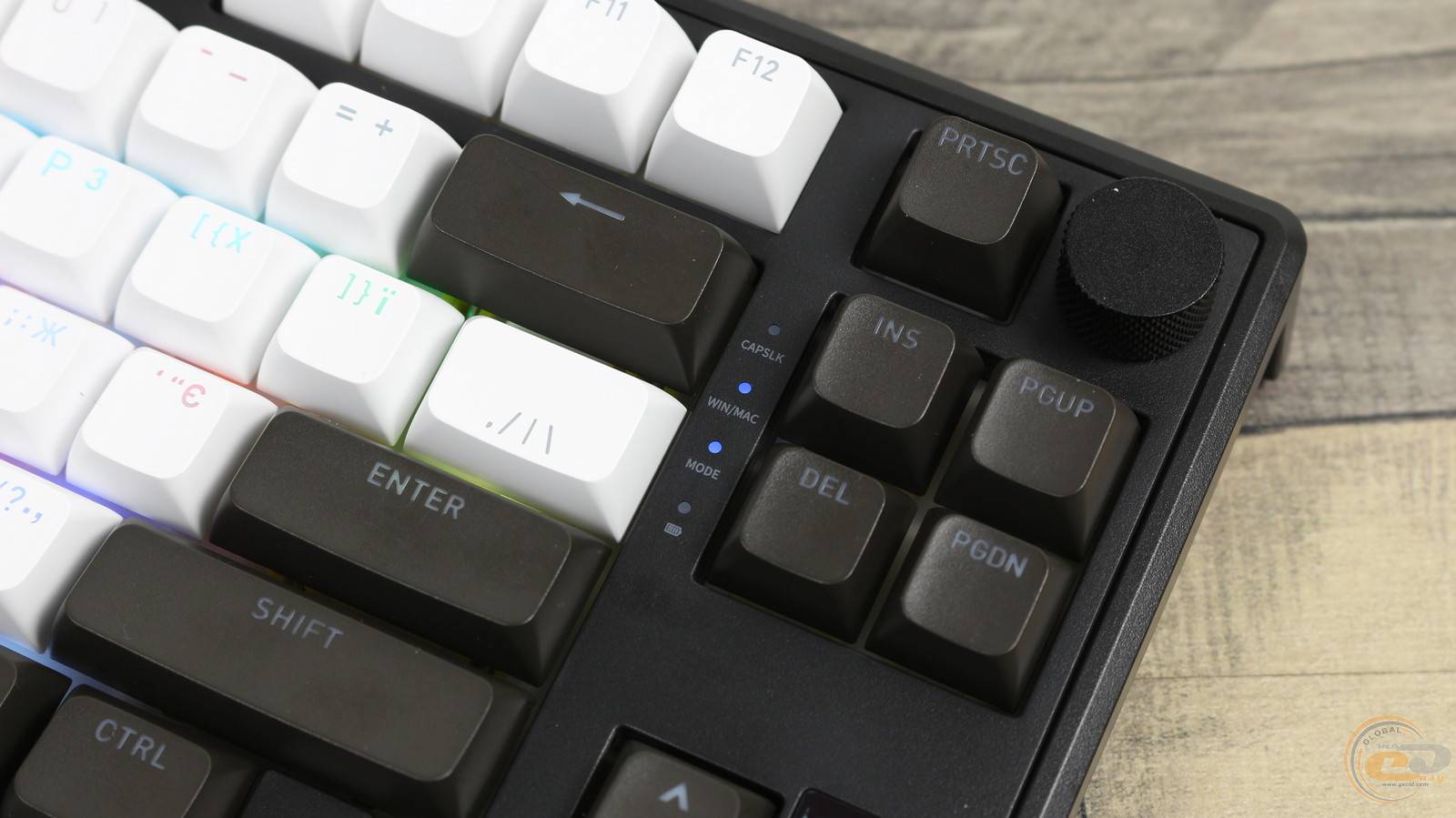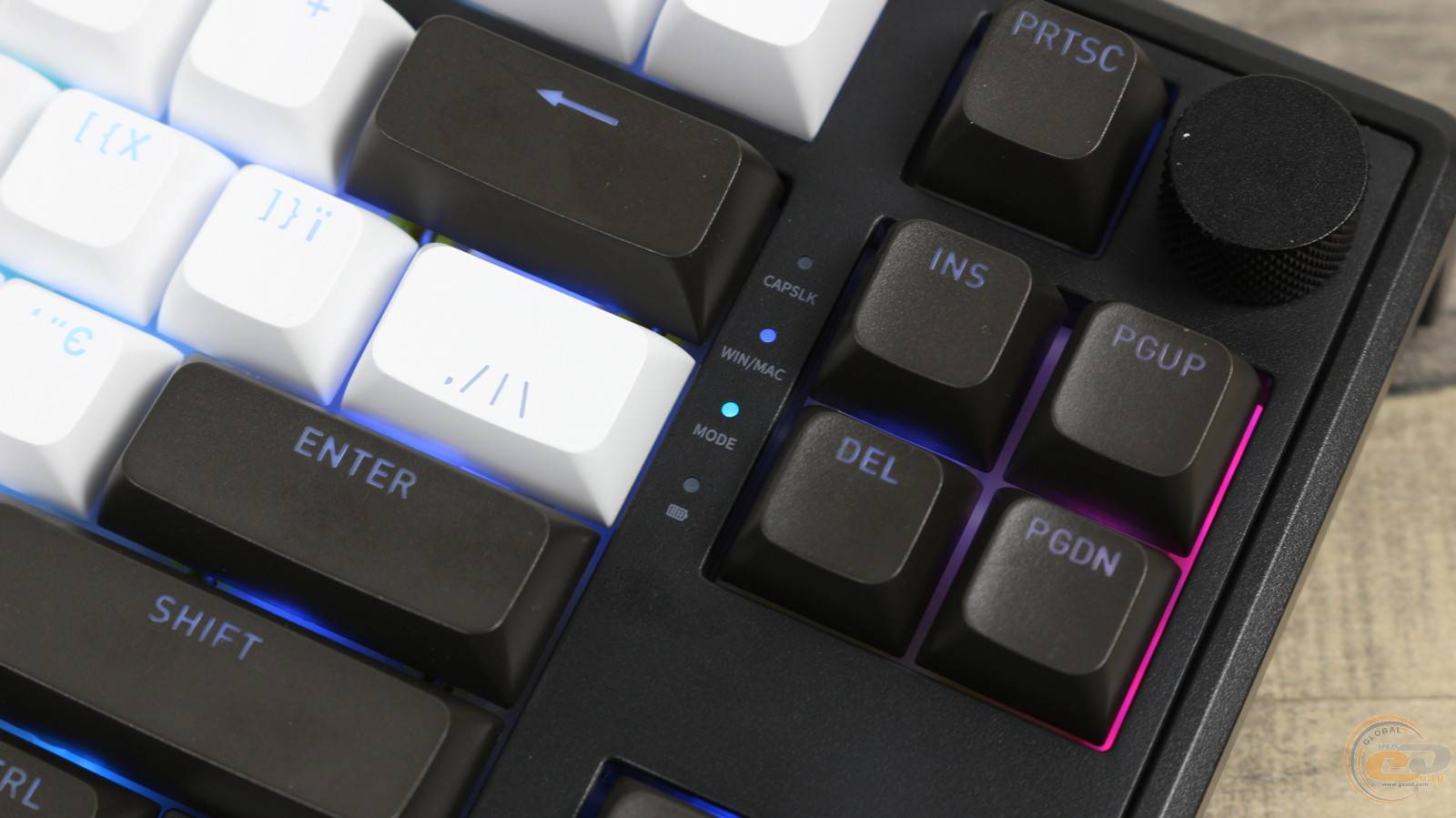 Між основним блоком клавіш і двома кнопками INS та DEL розташовані чотири світлодіодні індикатори: CAPS LOCK, WIN/MAC, MODE та Battery. Вони відображають відповідно статус Caps Lock, активну операційну систему (зелений — Windows, синій — macOS), тип підключення (зелений — 2.4 ГГц, синій — Bluetooth, білий — USB) та рівень заряду акумулятора. Під час заряджання відповідний індикатор світиться червоним, після повного заряду — вимикається, а при низькому рівні починає блимати. Індикація реалізована стримано, без надмірної яскравості, і не відволікає під час роботи.