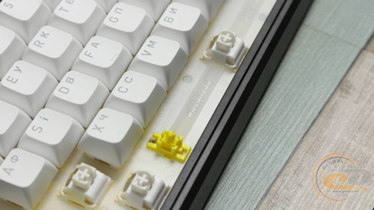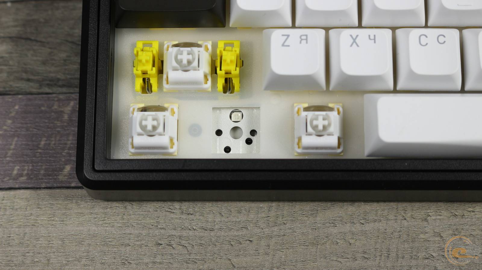 Плейт виконаний із прозорого полікарбонату, що сприяє рівномірності й яскравості RGB-підсвітки. Водночас використання жорсткого матеріалу без флекс-катів обмежує гнучкість конструкції. Реалізація gasket mount базова: силіконові демпфери навколо точок кріплення плейта частково приглушують вібрації, але не створюють ефекту «плавання».