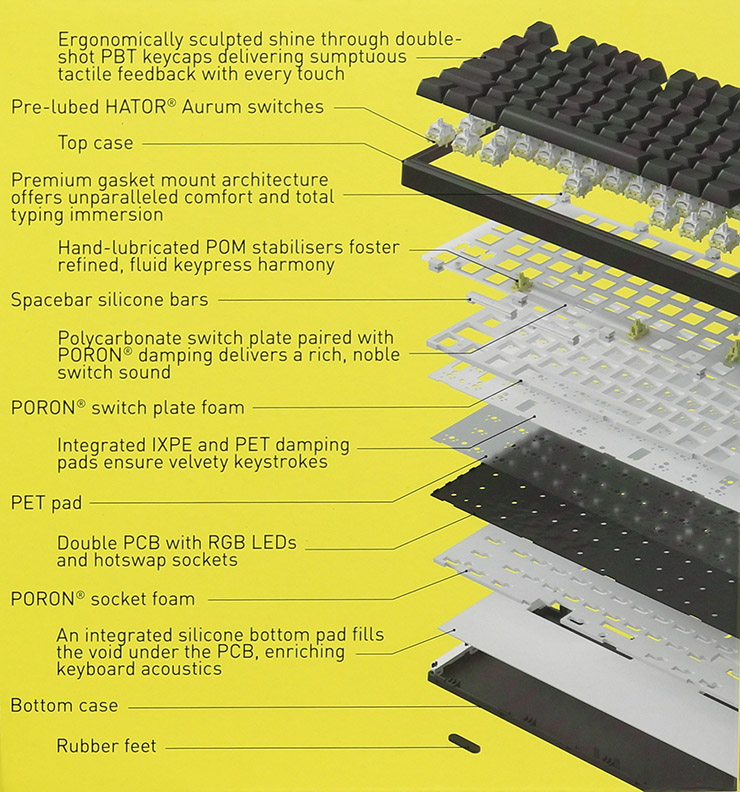Кейкапи виготовлені методом подвійного лиття (double-shot) з прозорим внутрішнім шаром для наскрізного підсвічування символів. У комплекті постачання відсутні кейкапи із російськомовними кейкапми, натомість маємо додатковий кейкап рожевого кольору із емблемою та візерунками HATOR. Його висота відповідає двом верхнім рядам, тож його місце на смак користувача – Esc, PrtSrcn або ~(тильда).