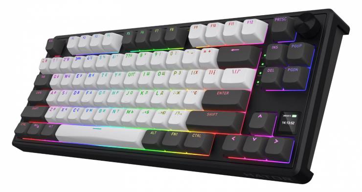 Кольоровий 0,85" TFT-екран справа від блоку стрілок — одна з ключових особливостей Skyfall 80 Pro Wireless. Він інтегрований у загальну логіку керування і виконує такі функції: