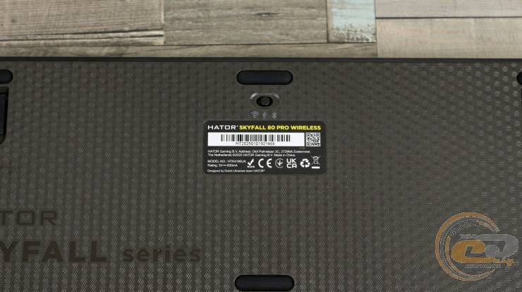 Нижня частина корпуса виготовлена з матового сірого пластику й має текстуру у вигляді шестикутних сот, що додає конструкції візуальної глибини. У центральній частині розміщена наліпка з інформацією про модель, серійним номером та сертифікаційними позначками. У лівому нижньому куті — рельєфний напис HATOR SKYFALL series, який слугує стильним акцентом. По периметру передбачено шість гумових ніжок, що забезпечують відмінну стабільність на поверхні незалежно від інтенсивності набору.