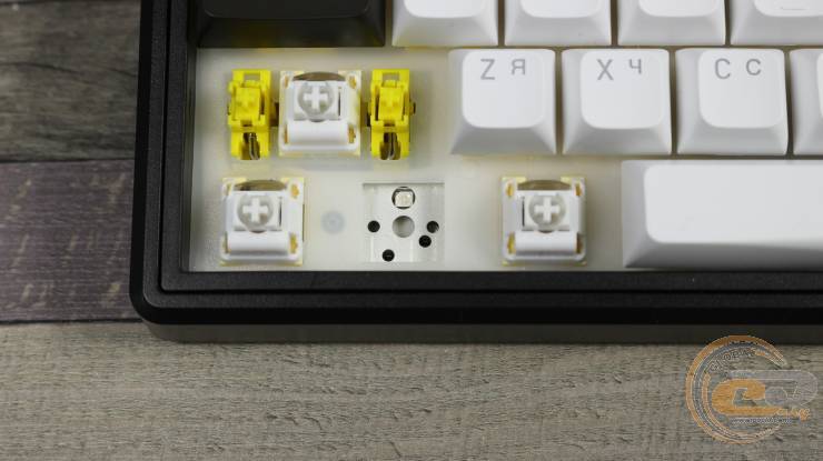Під пробілом встановлено стабілізатор із рівною металевою скобою, що забезпечує однакове відчуття натискання по всій площі клавіші — без перекосів чи провалів. З боків від перемикача розміщено два напівпрозорих бруски з еластичного пластику, які додатково гасить шум і покращують тактильні відчуття під час набору.
