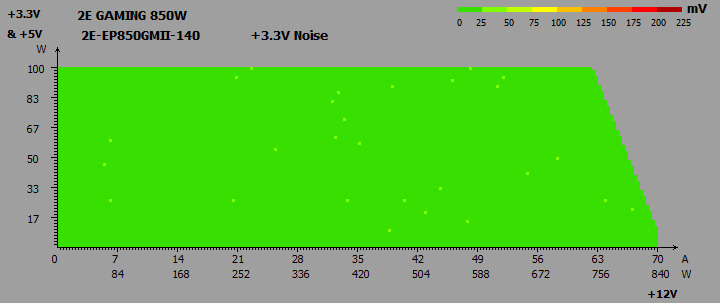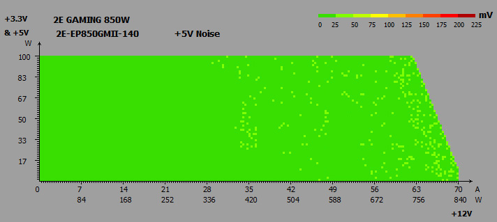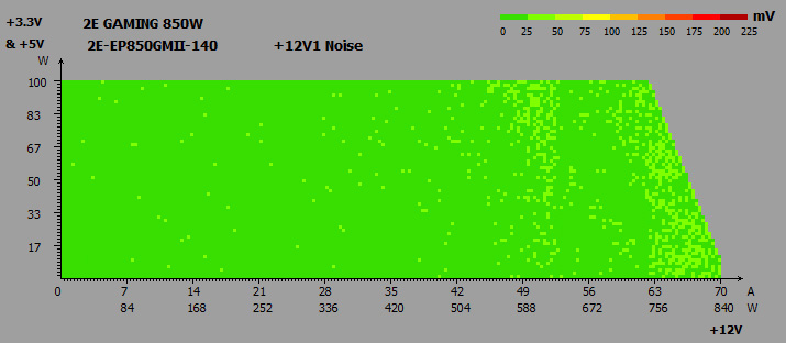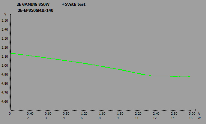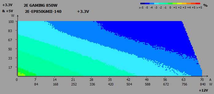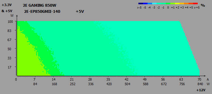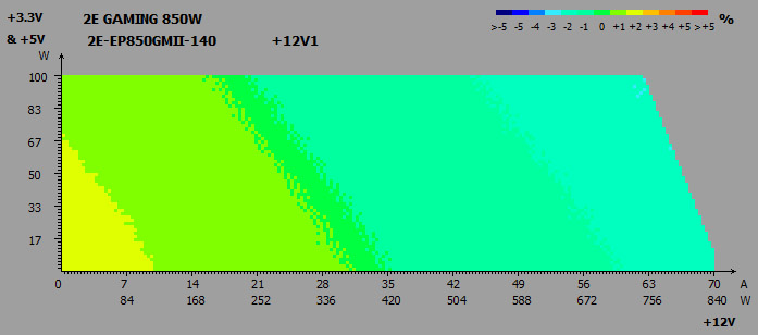 Завдяки використанню DC-DC-перетворювачів напруги на всіх трьох каналах перевищували номінальні значення в межах від 1,2% до 2,4%, що можна вважати відмінним результатом. Різниця між показниками у простої та під навантаженням також незначна — не більше 1,2%.