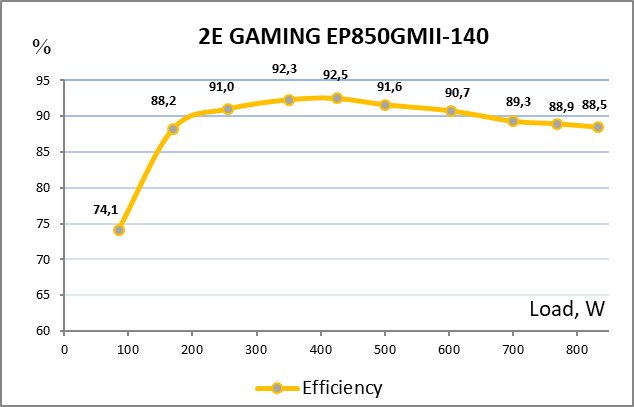 Енергоефективність блока живлення відповідає сертифікації 80 PLUS Gold. При навантаженні на рівні 20%, 50% та 100% від номінальної потужності коефіцієнт корисної дії перевищував необхідні значення — 88%, 92% та 88% відповідно.