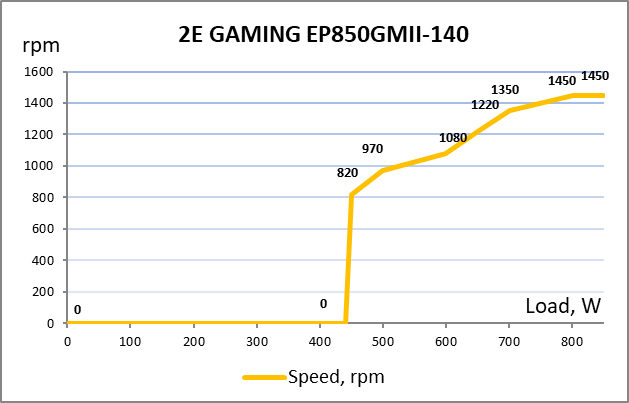 З увімкненим гібридним режимом роботи системи охолодження вентилятор 2E Gaming Extra Power Pro 850W стартує лише при навантаженні 440 Вт, що становить понад 50% від номіналу. До позначки 650 Вт він тихо працює на швидкості 820-1200 об/хв. Далі оберти зростають до максимальних 1450 об/хв, але рівень шуму залишається нижчим за середній і цілком комфортним для тривалої роботи за комп’ютером.