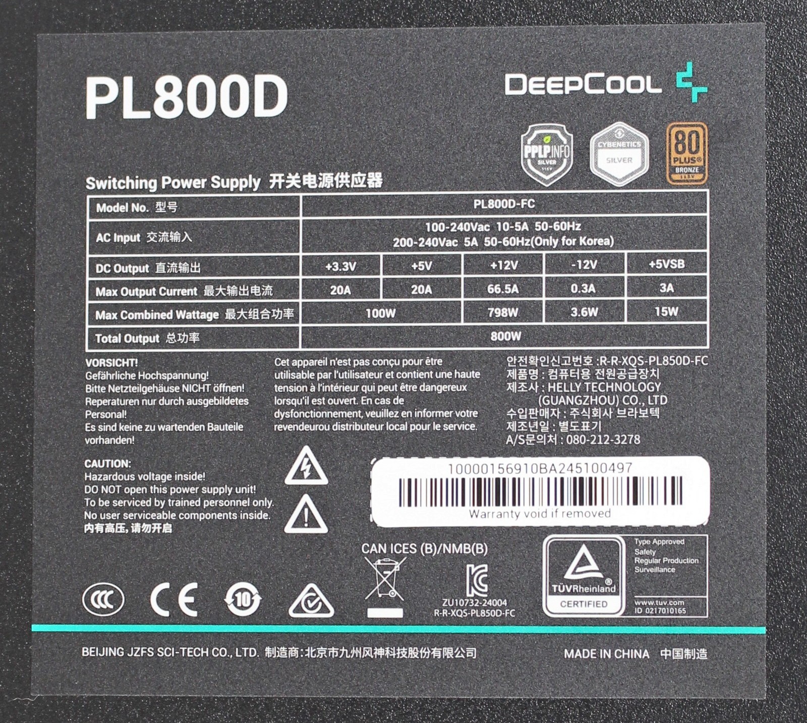 Етикетка повідомляє, що по лінії +12 В доступні 798 Вт потужності — гідний показник для 800-ватного блока живлення. Молодші канали +3,3 В та +5 В у сумі можуть забезпечити до 100 Вт навантаження або максимум по 20 А кожен. Також заявлено сертифікацію 80 PLUS Bronze, Cybenetics Silver та підтримку широкого діапазону вхідної напруги 100-240 В.