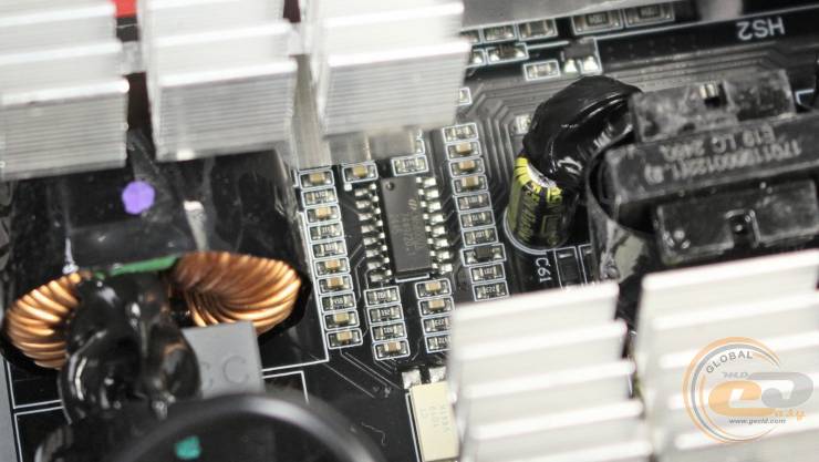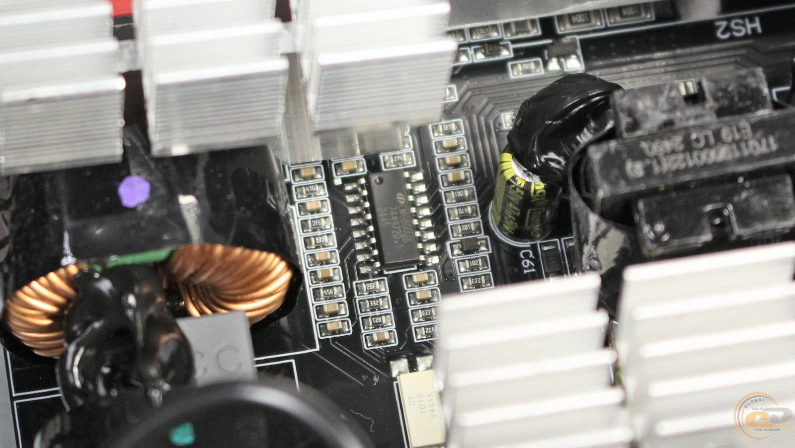 На ще одному радіаторі, розташованому по-сусідству, змонтовані два транзистори та діод Шотткі модуля APFC, які співпрацюють із габаритним дроселем.
