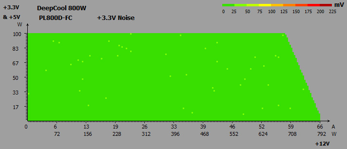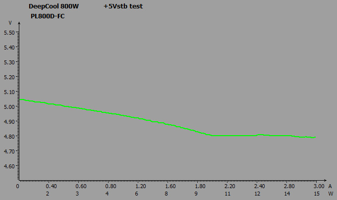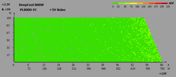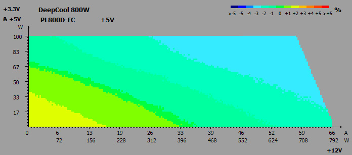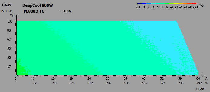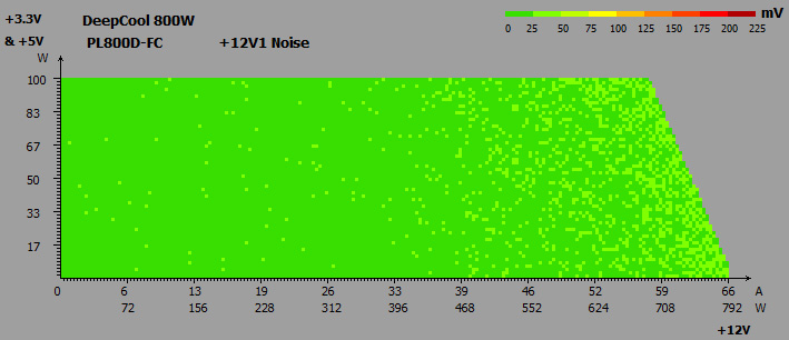 Модуль APFC, набраний у повному складі, також добре справляється зі своїми обов'язками. Так, максимальне значення коефіцієнта PF рівне 0,98 при номінальних 800 Вт.