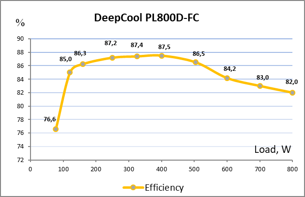 Енергоефективність блока живлення відповідає сертифікату 80 PLUS Bronze, адже за навантаження 20%, 50% і 100% від номінальної потужності ККД перевищував необхідні 81%, 85% і 81% відповідно.