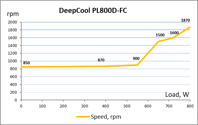 До навантаження 550 Вт пропелер дуже тихо обертається з частотою 850-900 об/хв. До 650 Вт при частоті обертання 1500 об/хв і нижче вертушка все ще залишається тихою. Далі швидкість поступово досягає максимальних 1870 об/хв, при цьому рівень шуму залишається нижчим за середній.