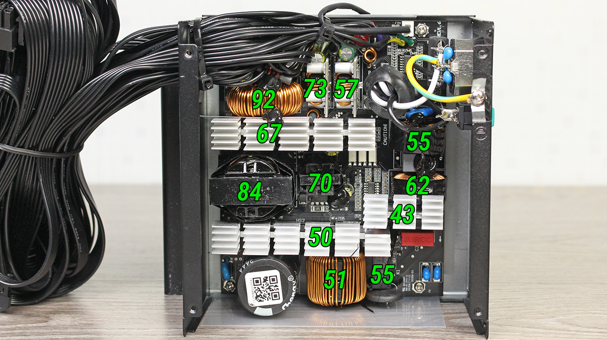 Після 15-хвилинного навантаження потужністю 750 Вт головний трансформатор прогрівся до 84°C, що є цілком прийнятним показником. Водночас температура дроселя лінії +12В досягла 92°C — це вже доволі високе значення. До того ж він додатково нагріває розташовані поруч конденсатори. З огляду на це, даний блок живлення доцільно експлуатувати при навантаженні не вище 650–700 Вт.