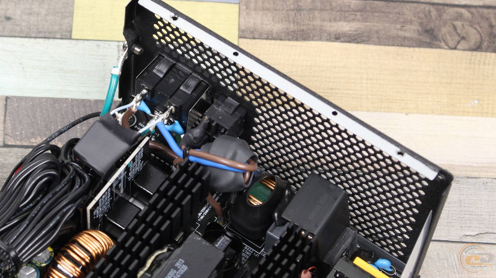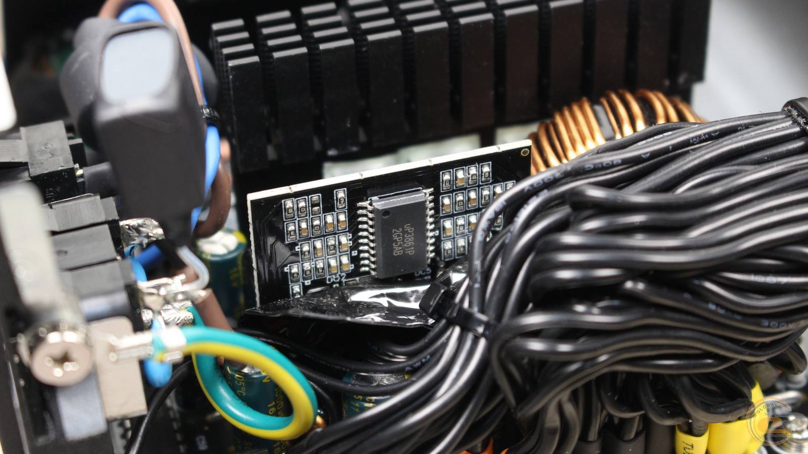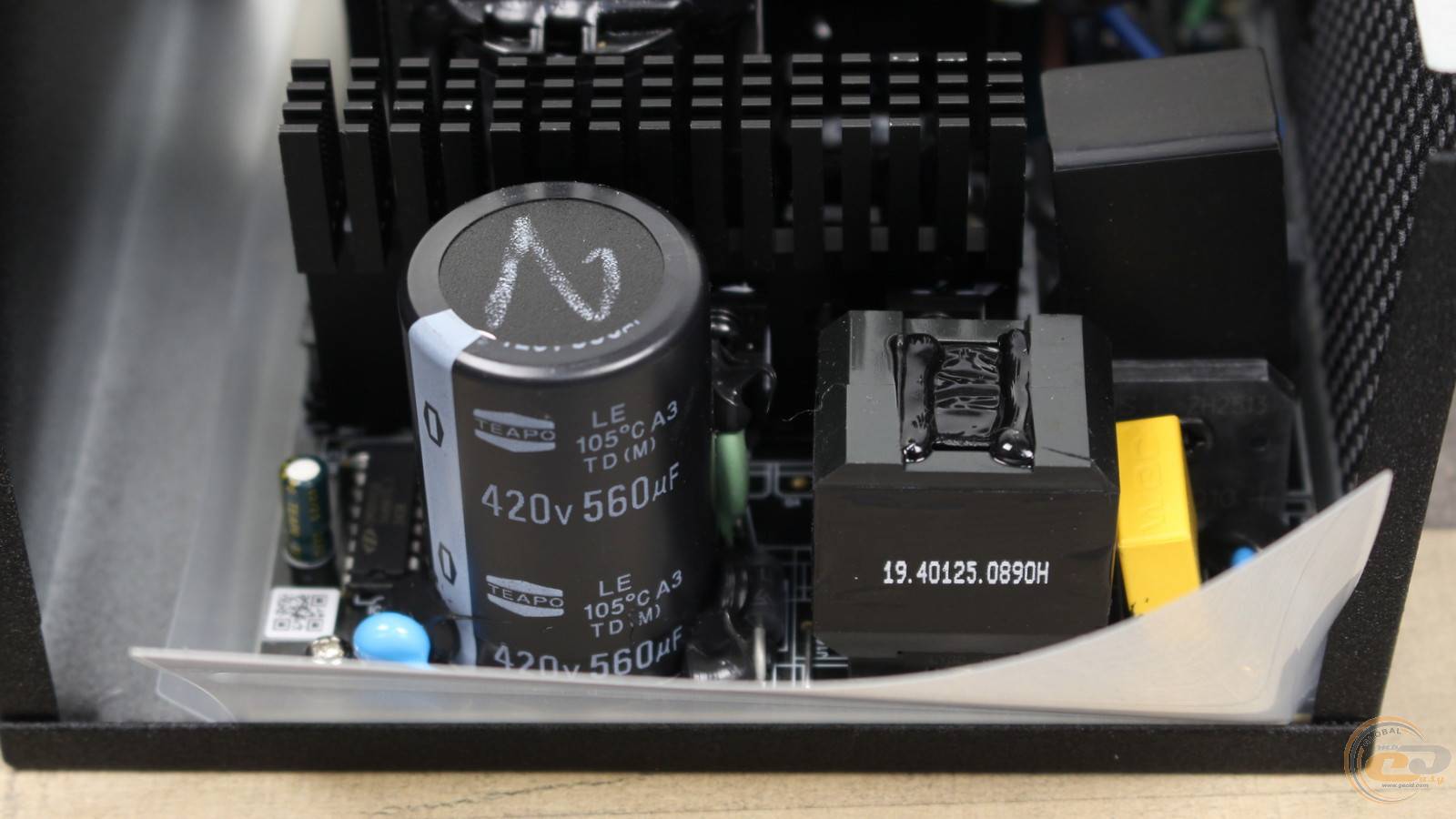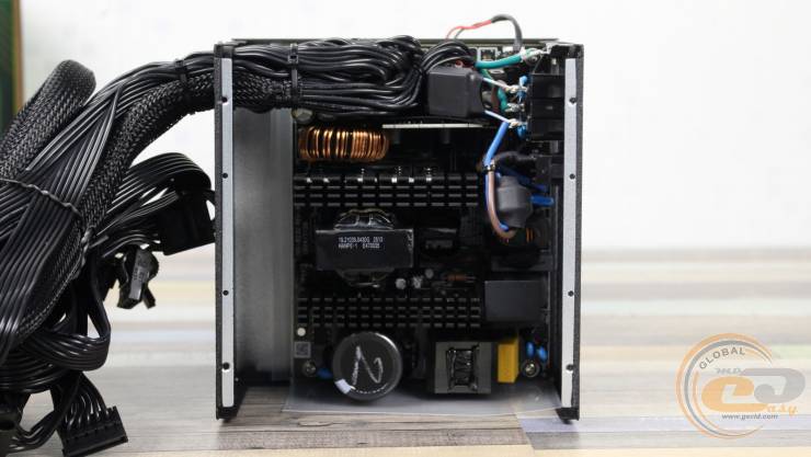 Далі розташований габаритний дросель вузла APFC, радіатор із силовими елементами та терморезистор. Вхідний високотемпературний конденсатор виготовлений тайванською компанією TEAPO, втім його ємність порівняно невелика для 850-ватника.
