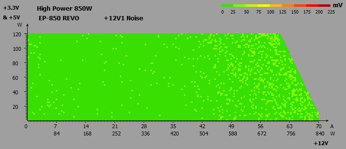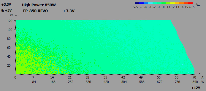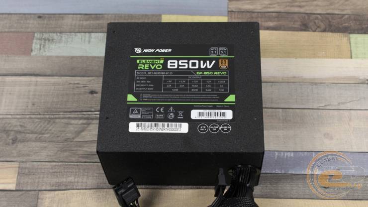 Єдина наліпка повідомляє електротехнічні характеристики HIGH POWER EP-850 REVO. Потужність лінії +12В становить 850 Вт і повністю відповідає номінальній. Молодші канали +3,3В та +5В мають сумарну потужність 120 Вт або максимум по 22 А — це відмінні показники, які повністю збігаються з аналогічними значеннями у 750-ватної моделі.