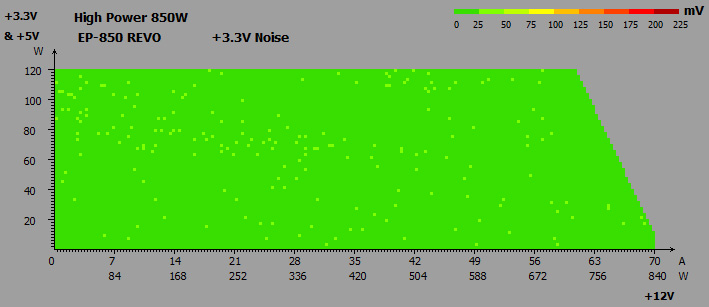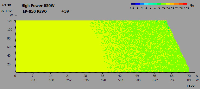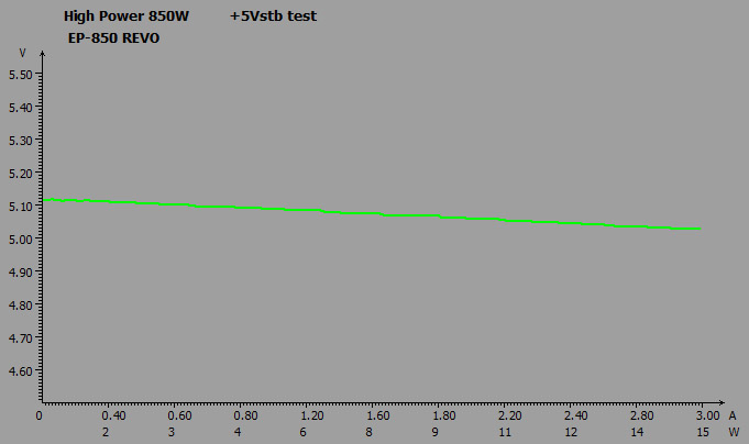 Використання DC-DC-перетворювачів принесло хороші плоди: напруги на трьох основних лініях перевищували номінальні значення на 1,5-3,8% — це дуже хороші показники, які залишаються далекими від граничних меж. А різниця між показниками у простої та під навантаженням і зовсім незначна — не більше 0,9%. Що ж до просідань напруг нижче номіналів, то їх не було.