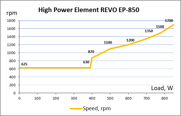 До позначки 400 Вт вентилятор HIGH POWER EP-850 REVO дуже тихо працює на швидкості 620-630 об/хв. Далі до 1300 об/хв при 700 Вт звук від пропелера залишається тихим. І тільки в діапазоні від 700 до 850 Вт вертушка розганяється до 1700 об/хв, а шум досягає все ще комфортного рівня нижчого за середній.
