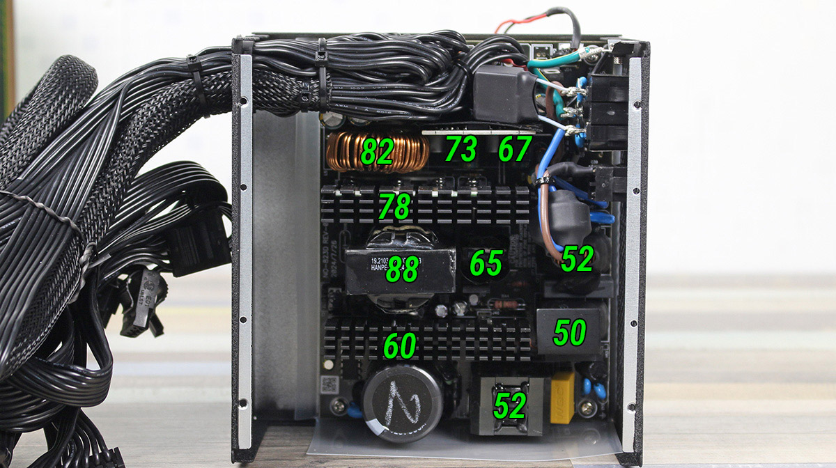 Після 20-хвилинного тестування під навантаженням 800 Вт головний трансформатор прогрівся до 88°C, що є доволі високим показником. Значне нагрівання спостерігалося й у вихідного дроселя — до 82°C, а він, у свою чергу, підігріває розташовані поруч електролітичні конденсатори.