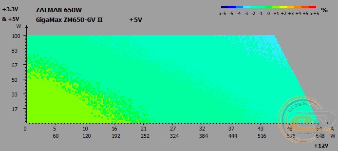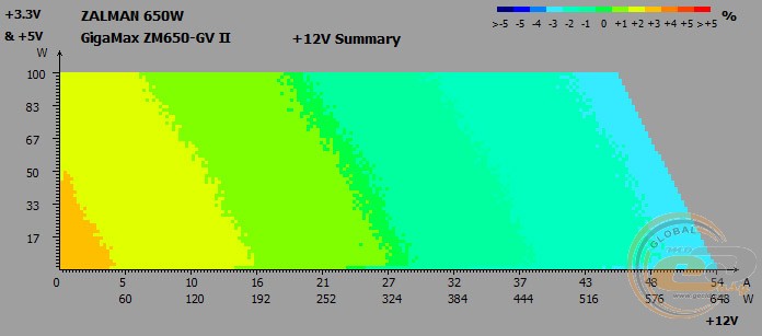 Тест реальної ефективності при різних навантаженнях підтвердив відповідність моделі ZALMAN GigaMax 650W стандарту 80 PLUS Bronze 230V EU. При навантаженнях 20%, 50% і 100% від номінальної потужності ККД блока живлення перевищував 85%, 88% і 85% відповідно. Найбільш ефективним джерело виявився при навантаженні від 200 до 500 Вт - у цьому діапазоні ККД перевищує 86%.