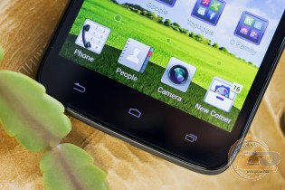Більшу частину лицевої панелі займає дисплей, прикритий мінеральним склом (марку якого виробник не повідомляє), що по контуру має чорний глянцевий кант на одному рівні зі склом. Зверху над дисплеєм знаходяться: чимала решітка розмовного динаміка, логотип виробника, датчики освітлення та наближення, фронтальна камера, а також індикатор подій (можна вимкнути в налаштуваннях). Останній, при наявності пропущених подій чи дзвінків миготить зеленим, при вичерпанні заряду – червоним, в процесі зарядки акумулятора – горить червоним, а по закінченню зарядки – загорається зеленим. Під дисплеєм розташовані три звичних сенсорних кнопки керування: «Меню», «Додому» і «Назад». Вони нанесені напівпрозорою білою фарбою: вдень видно і без підсвічування, а вночі воно не б'є по очах (можливості регулювання чи відключення ілюмінації немає).
