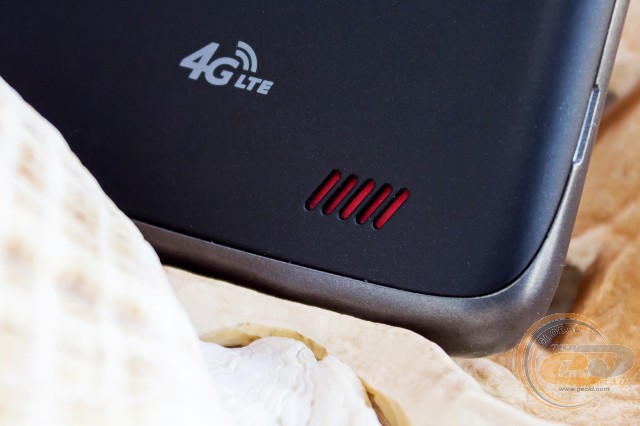 Тильна сторона BenQ F5 виконана з темного-сірого матового софт-тач пластику з дрібними вкрапленнями, що весело грають на світлі. Пластик приємний на дотик, але досить мазкий, про що свідчать залишки відбитків пальців. З самого верху розташувався об’єктив основної камери (обрамлений в червоне кілечко) та односекційний LED-спалах (ПЗ ліхтарик присутнє). Нижче, в центральній частині, нанесено чималий логотип компанії BenQ. Ближче до низу – позначення «4G LTE». В правій нижній частині розміщена решітка мультимедійного динаміка.
