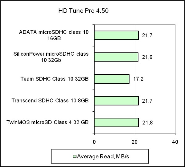 Карта пам'яті ADATA microSDHC Class 10 16GB показала відмінні результати в ході тестування. Показники швидкості читання і запису даних виявилися на рівні 22-23 МБ/з і 22 МБ/з відповідно, що навіть перевищує заявлені виробником характеристики. А порівняно з мінімальним значенням швидкості запису для Class 10 (нагадаємо, не менше 10 МБ/с), швидкість запису тестованої карти виявилася в два рази більше. До цих показників варто додати і дуже малий час доступу до даних - 0,4 мс. В цілому, це рішення відмінно впорається з різноманітними завданнями, будь то перегляд відео високої чіткості, часте копіювання великої кількості файлів малого об'єму або використання карти в сучасних цифрових фотоапаратах і відеокамерах.